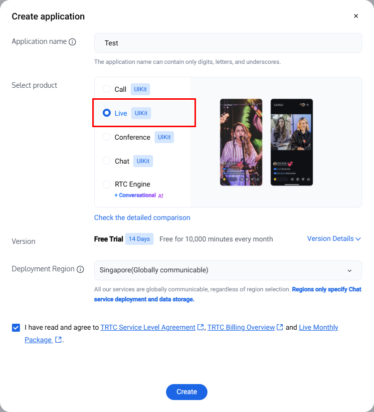 为了您能更好地体验互动直播 Live 的功能,我们免费为每个 SDKAppID 提供了14天体验版(体验版不额外赠送通话时长),每个 SDKAppID 可免费体验2次,每次有效期均为14天;同时一个账号下所有 SDKAppID 的体验总次数为10次。