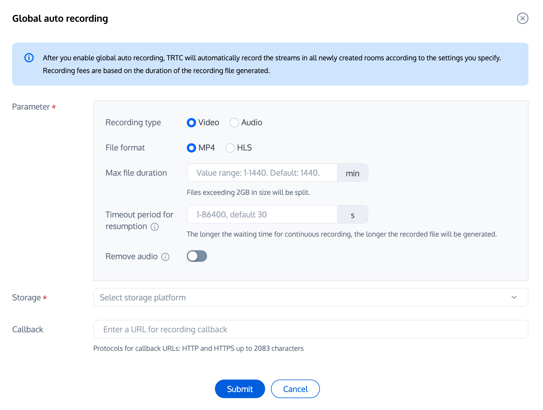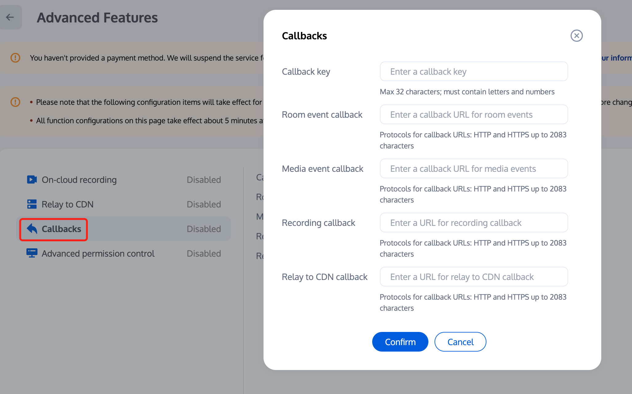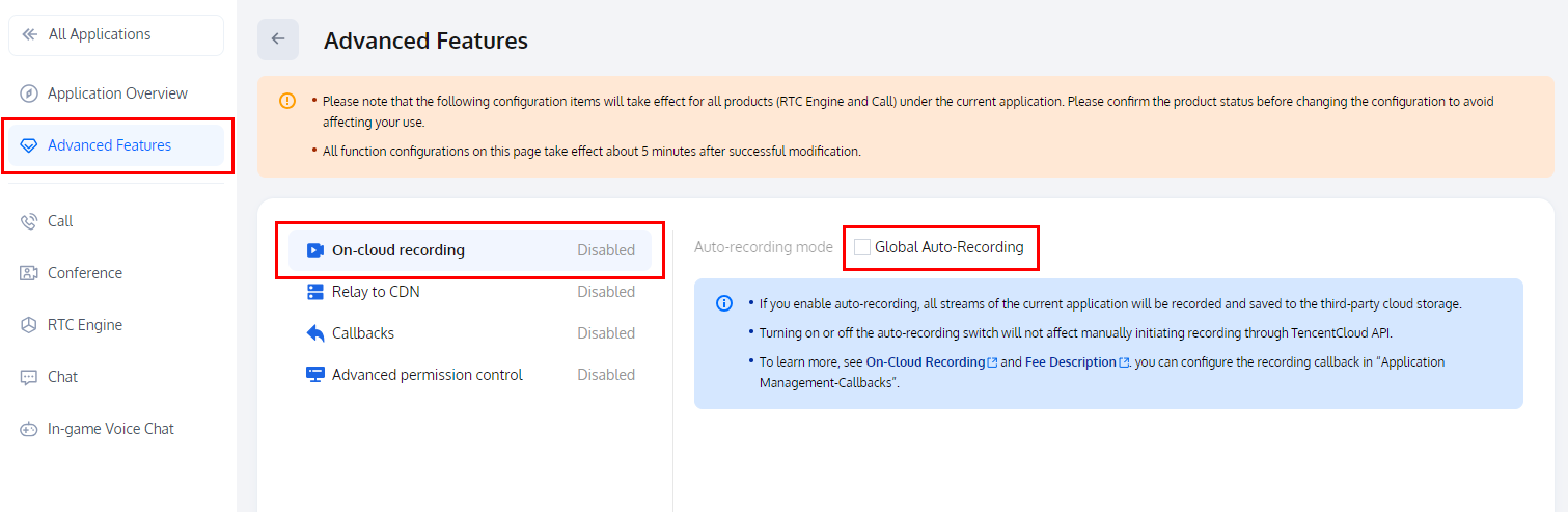 2. 在高级功能配置页,您可以看到云端录制配置的选项,启用云端录制功能。这里建议关闭全局自动录制,此时默认为手动自定义录制,即 REST API 模式。