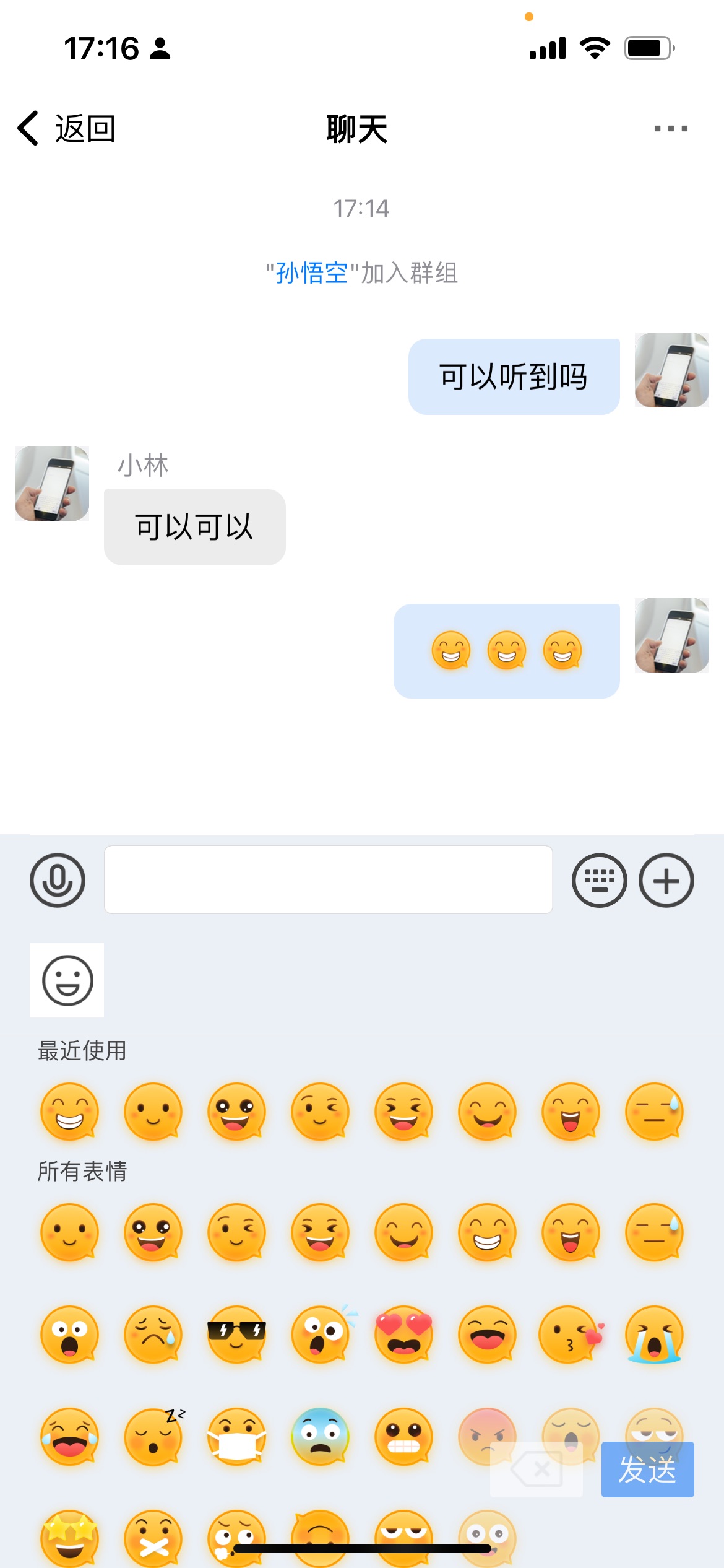 点击聊天界面编辑消息栏中的表情图标,出现表情列表,点击对应表情即可进行发送,为演讲人的精彩发言点赞。