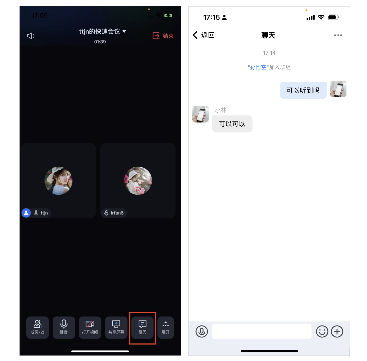 在会议界面底部菜单栏中,您可以找到一个名为聊天的选项。点击它,会跳转到聊天页面。在聊天页面,参会人员可以通过发送自定义文字信息与其他参会者进行沟通。这样的设计既方便了参会者之间的实时交流,又不会影响到正在发言的人。