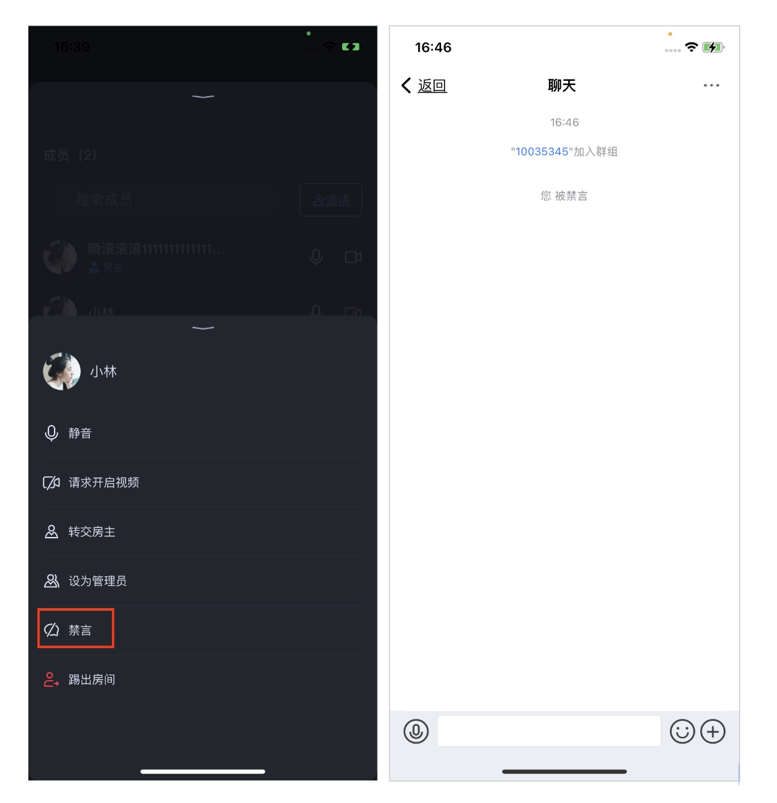 主持人/管理员可在成员管理中设置某一成员的聊天权限。如果被禁言,普通成员无法进行文字或表情的编辑和发送。