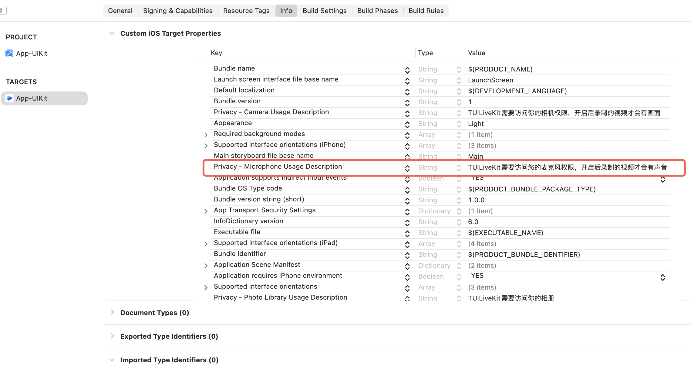 Info.plist 文件中添加以下两项,并填写对应的使用说明,这些说明将在系统请求权限时向用户显示:<key>NSMicrophoneUsageDescription</key><string>TUILiveKit需要访问您的麦克风权限,开启后录制的视频才会有声音</string>