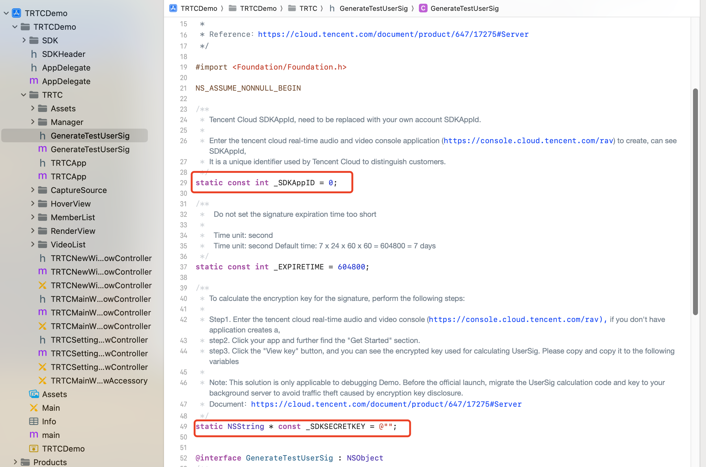 TRTCDemo/TRTC目录下GenerateTestUserSig.h中的 SDKAppID 和 SDKSecretKey 修改为在步骤2中获得的值。