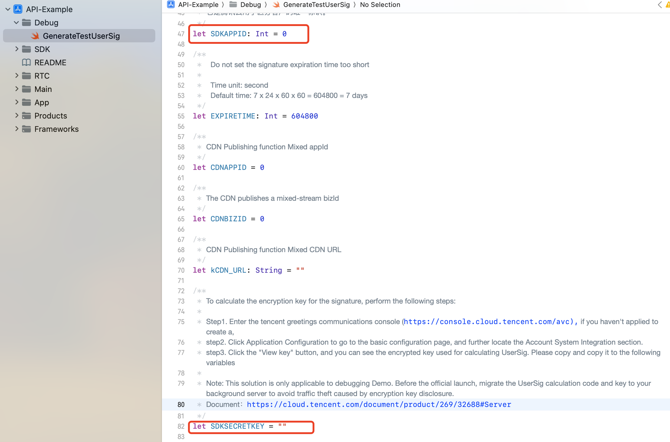 API-Example/Debug目录下GenerateTestUserSig.swift中的 SDKAppID 和 SDKSecretKey 修改为在步骤2中获得的值。