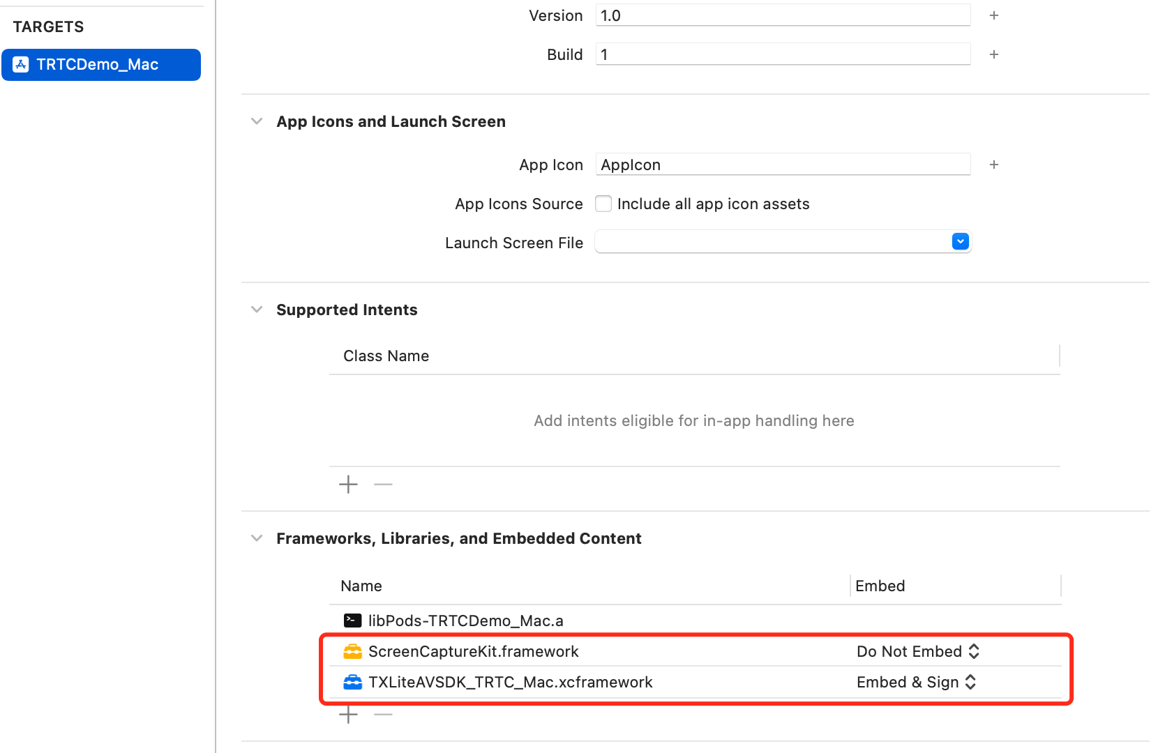 pod install执行完成,会生成新的的 .xcworkspace 工程文件,双击打开.xcworkspace 文件进行后续工作。.xcworkspace工程文件后,在 Xcode 的导航栏中点击左侧的 Project Navigator,点击您的项目名称并确保在编辑区域选择正确的 TARGETS。General选项卡的 Frameworks, Libraries, and Embedded Content 部分添加 TXLiteAVSDK_TRTC_Mac.xcframework 和 ScreenCaptureKit.framework。