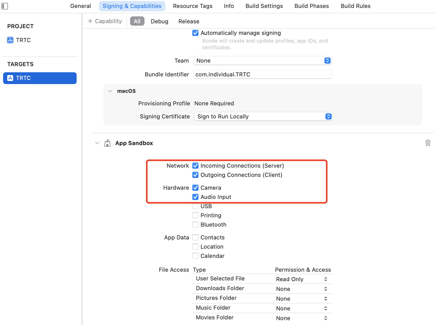 Signing & Capabilities选项卡中 App Sandbox 部分勾选以下内容。