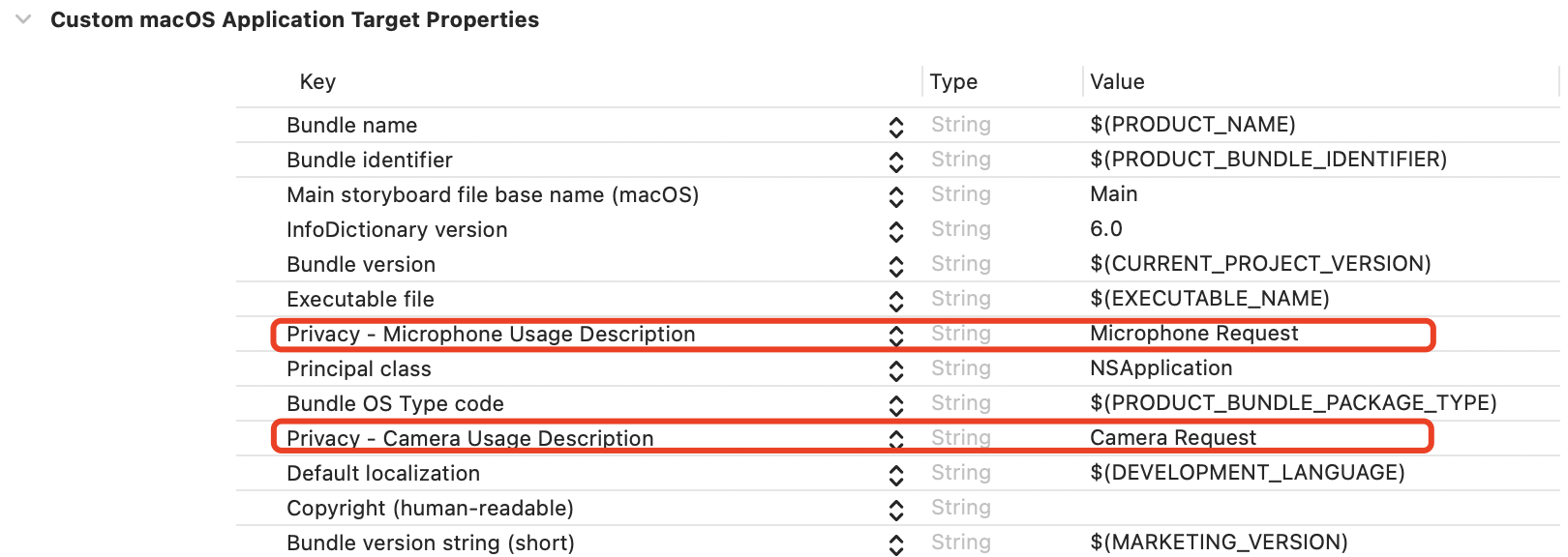 Info.plist选项卡中添加 Privacy-Microphone Usage Description 和 Privacy-Microphone Usage Description ,并填入 Microphone/Camera 使用的目标提示语,获取麦克风和摄像头的使用权限。
