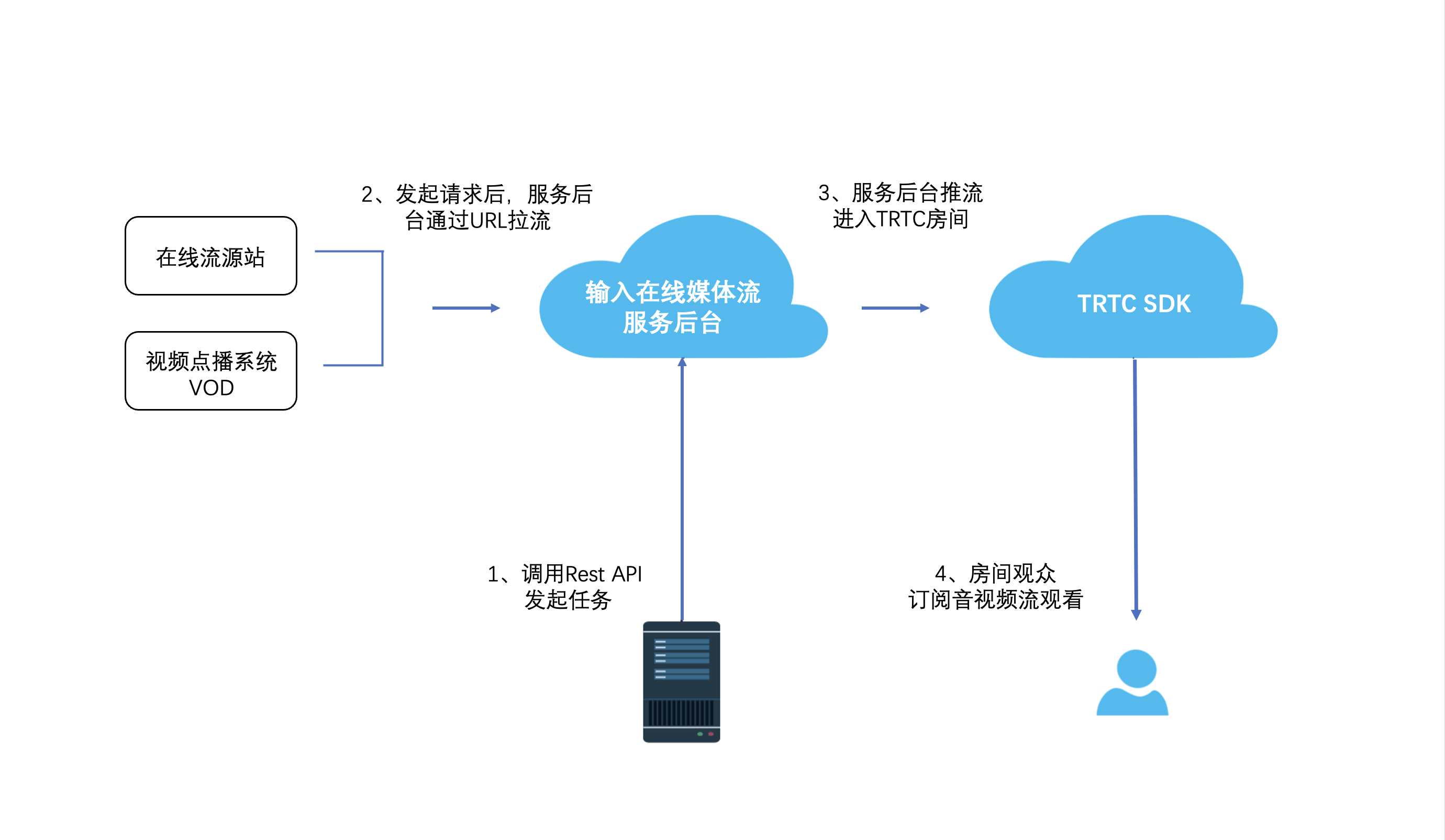 发起任务方式 | 用户可以通过 REST API 发起输入在线媒体流任务,观众可观看这路流,支持录制、转推等功能。 |
