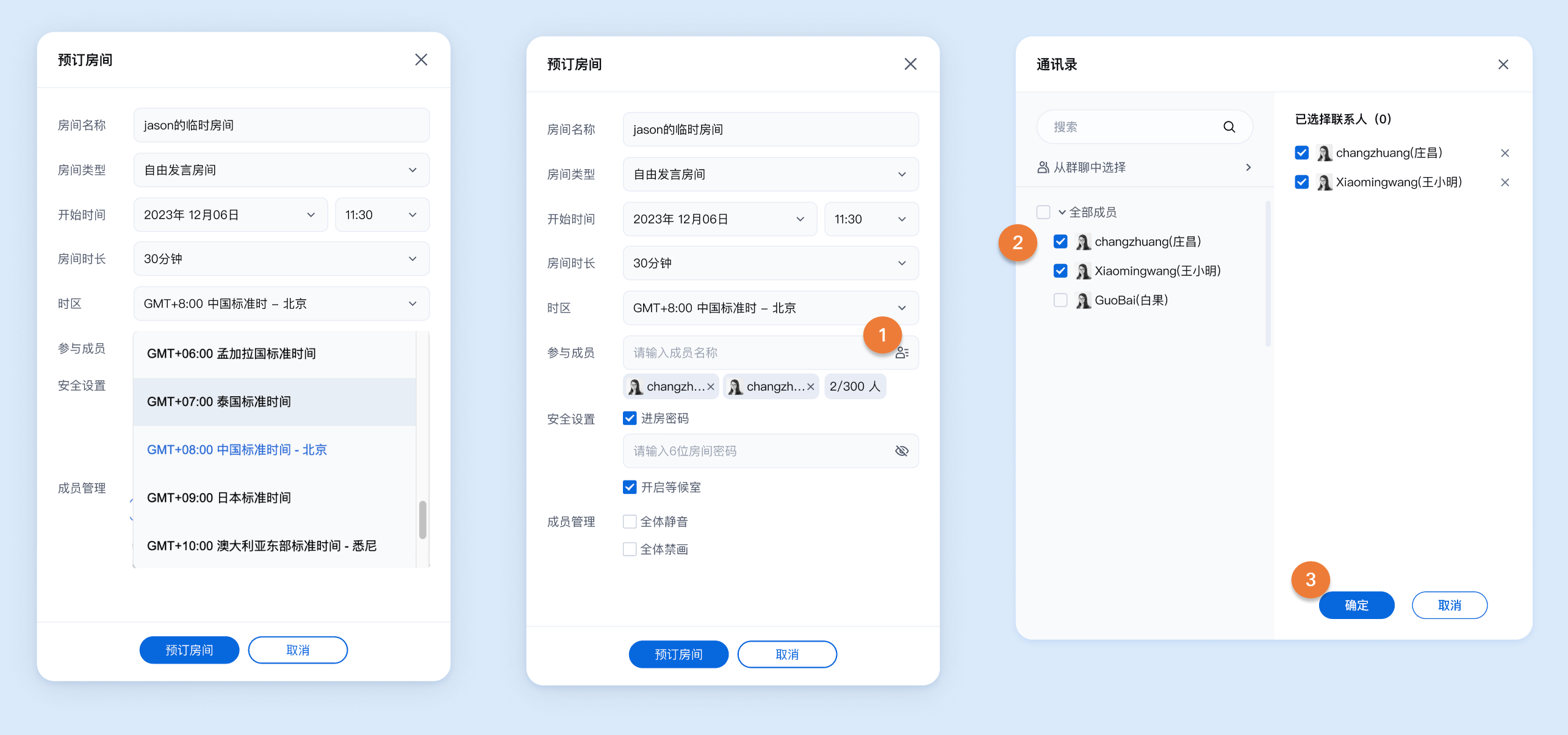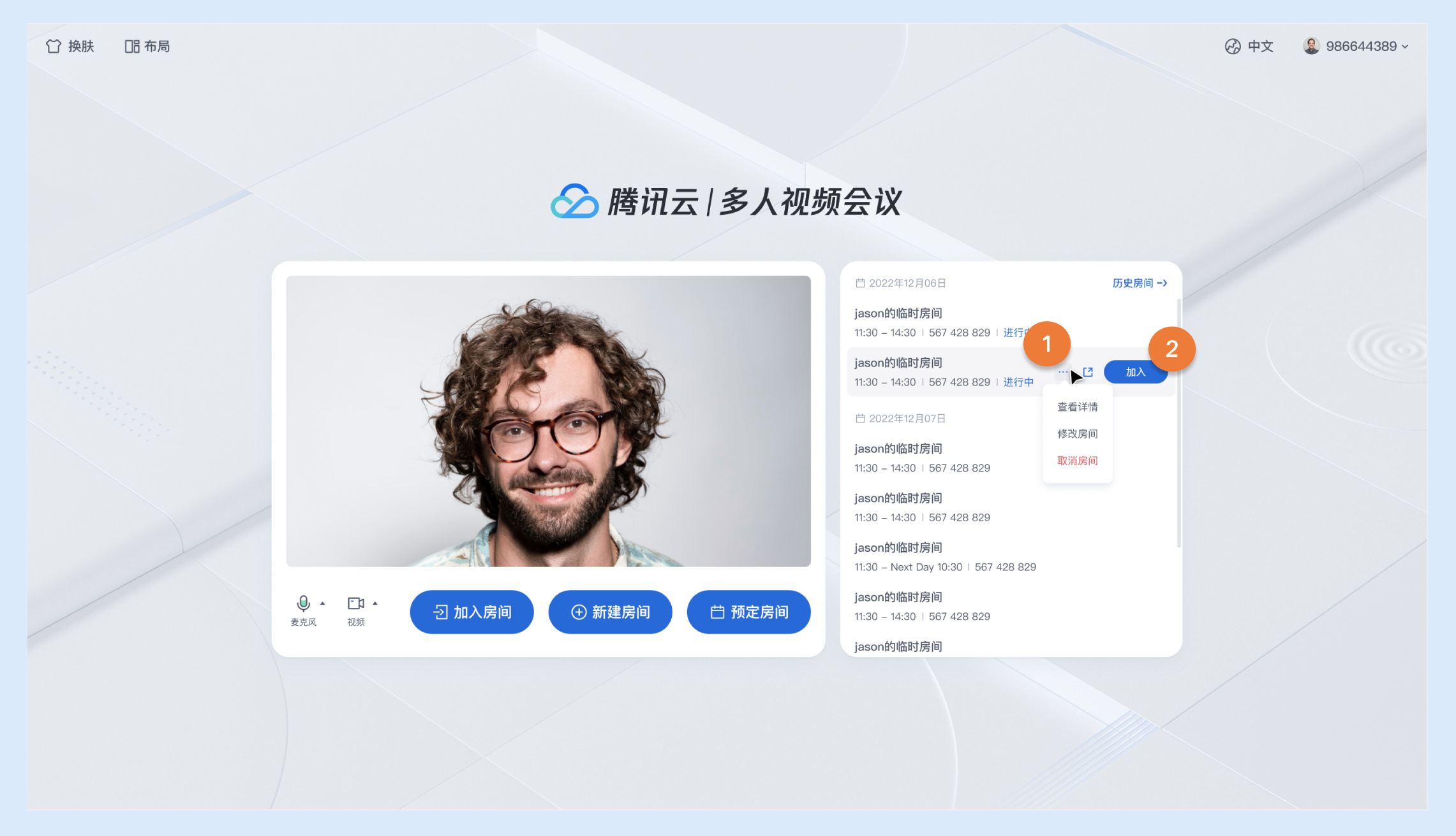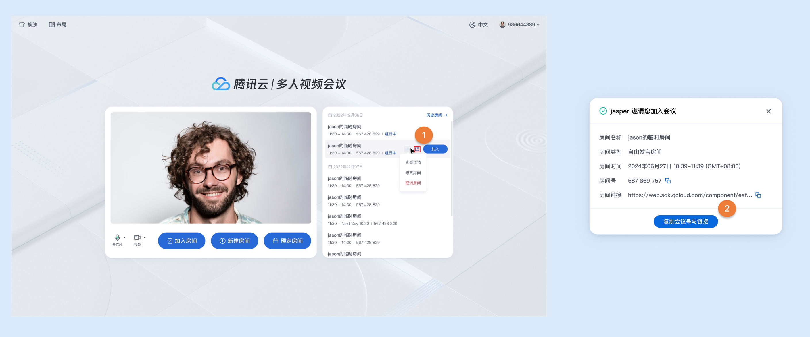 <template><PreConferenceViewv-if="isShowPreConferenceView":enable-scheduled-conference="true" // 设置是否开启预定房间特性展示@on-enter-room="handleEnterRoom"></PreConferenceView><ConferenceMainViewv-elsedisplay-mode="permanent"@on-destroy-room="onDestroyRoom"></ConferenceMainView></template><script setup lang="ts">import { ref } from 'vue';// 注意包的名称,如果您使用 vue2 版本请更改包名为 @tencentcloud/roomkit-electron-vue2.7import { PreConferenceView, conference, ConferenceMainView } from '@tencentcloud/roomkit-electron-vue3';const isShowPreConferenceView = ref(true);const init = async () => {conference.login({// 获取 sdkAppId 可参考文档开通服务部分,https://www.tencentcloud.com/document/product/647/104842?from_cn_redirect=1sdkAppId: 0,// 用户在您业务中的唯一标示 IduserId: '',// 本地开发调试可在 https://console.tencentcloud.com/trtc/usersigtool 页面快速生成 userSig, 注意 userSig 与 userId 为一一对应关系userSig: '',});}init();async function handleEnterRoom(roomOption: Record<string, any>) {const { roomId } = roomOption;await conference.join(roomId, {isOpenCamera: false,isOpenMicrophone: false,});isShowPreConferenceView.value = false;}function onDestroyRoom() {isShowPreConferenceView.value = true;init();}</script>
