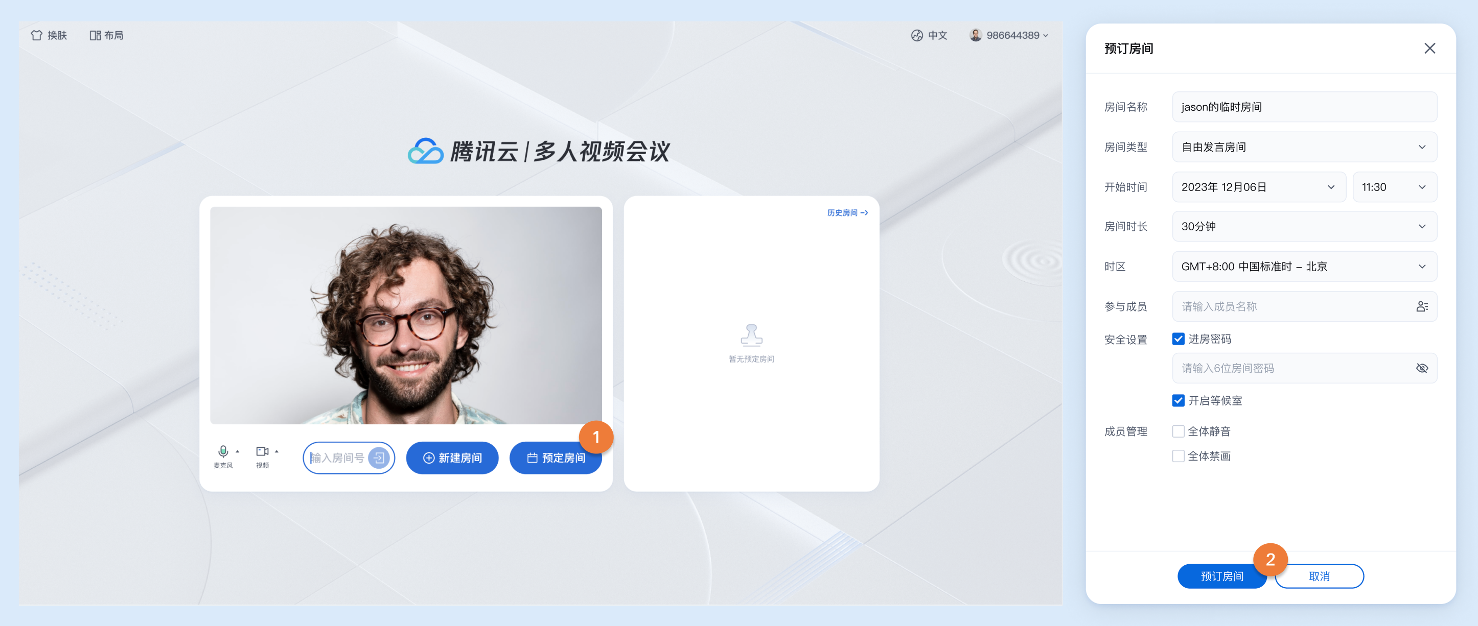 <template><PreConferenceViewv-if="isShowPreConferenceView":enable-scheduled-conference="true" // 设置是否开启预定房间特性展示@on-enter-room="handleEnterRoom"></PreConferenceView><ConferenceMainViewv-elsedisplay-mode="permanent"@on-destroy-room="onDestroyRoom"></ConferenceMainView></template><script setup lang="ts">import { ref } from 'vue';// 注意包的名称,如果您使用 vue2 版本请更改包名为 @tencentcloud/roomkit-web-vue2.7import { PreConferenceView, conference, ConferenceMainView } from '@tencentcloud/roomkit-web-vue3';const isShowPreConferenceView = ref(true);const init = async () => {conference.login({// 获取 sdkAppId 可参考文档开通服务部分,https://www.tencentcloud.com/document/product/647/104842?from_cn_redirect=1sdkAppId: 0,// 用户在您业务中的唯一标示 IduserId: '',// 本地开发调试可在 https://console.tencentcloud.com/trtc/usersigtool 页面快速生成 userSig, 注意 userSig 与 userId 为一一对应关系userSig: '',});}init();async function handleEnterRoom(roomOption: Record<string, any>) {const { roomId } = roomOption;await conference.join(roomId, {isOpenCamera: false,isOpenMicrophone: false,});isShowPreConferenceView.value = false;}function onDestroyRoom() {isShowPreConferenceView.value = true;init();}</script>