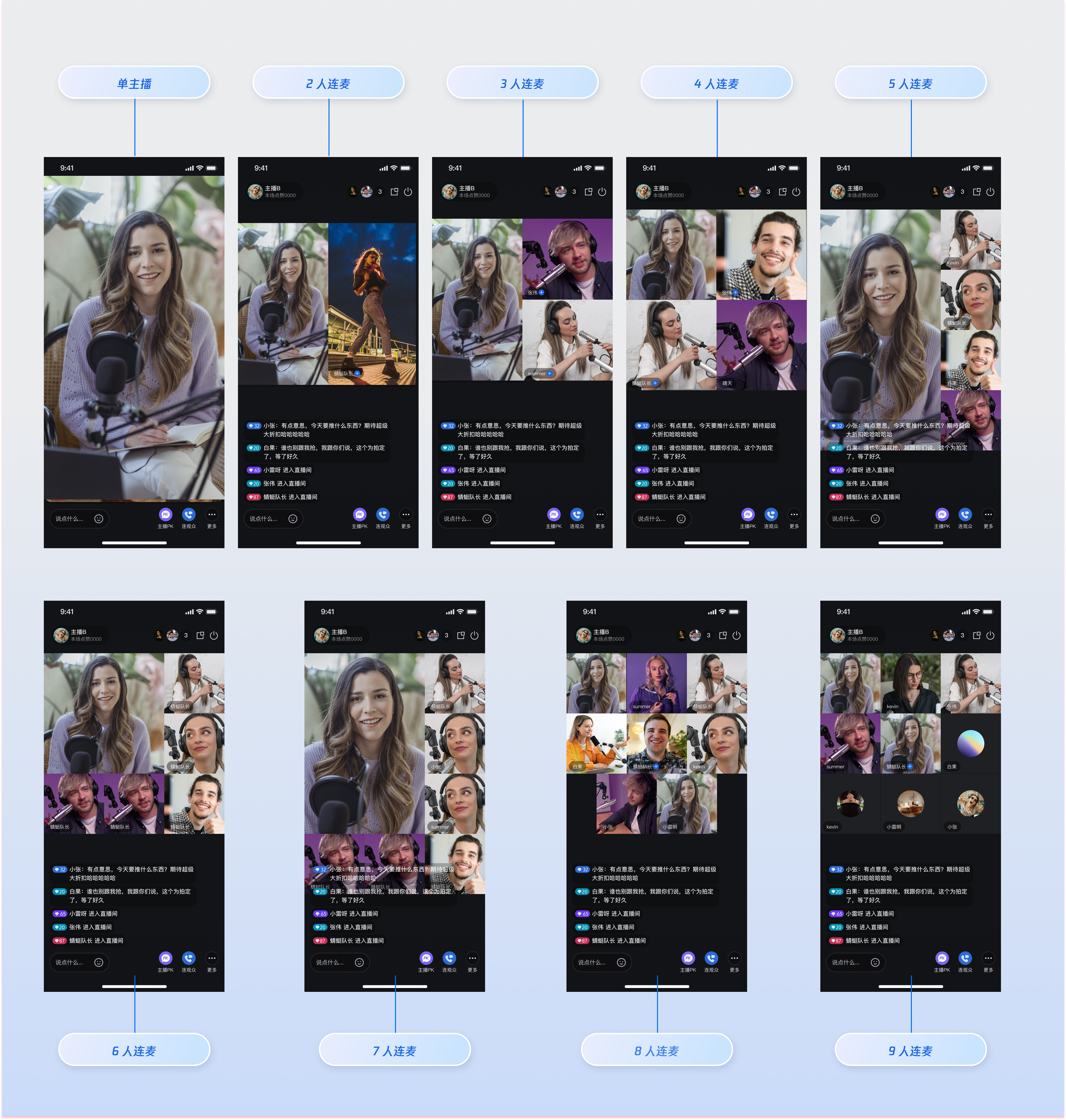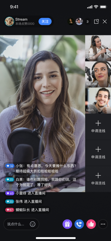 描述 | 默认布局,可根据连麦人数动态调整宫格大小。 | 连麦嘉宾以浮动小窗形式显示。 | 连麦人数固定,每个嘉宾占据一个固定宫格。 | 连麦人数固定,嘉宾以固定小窗形式显示。 |