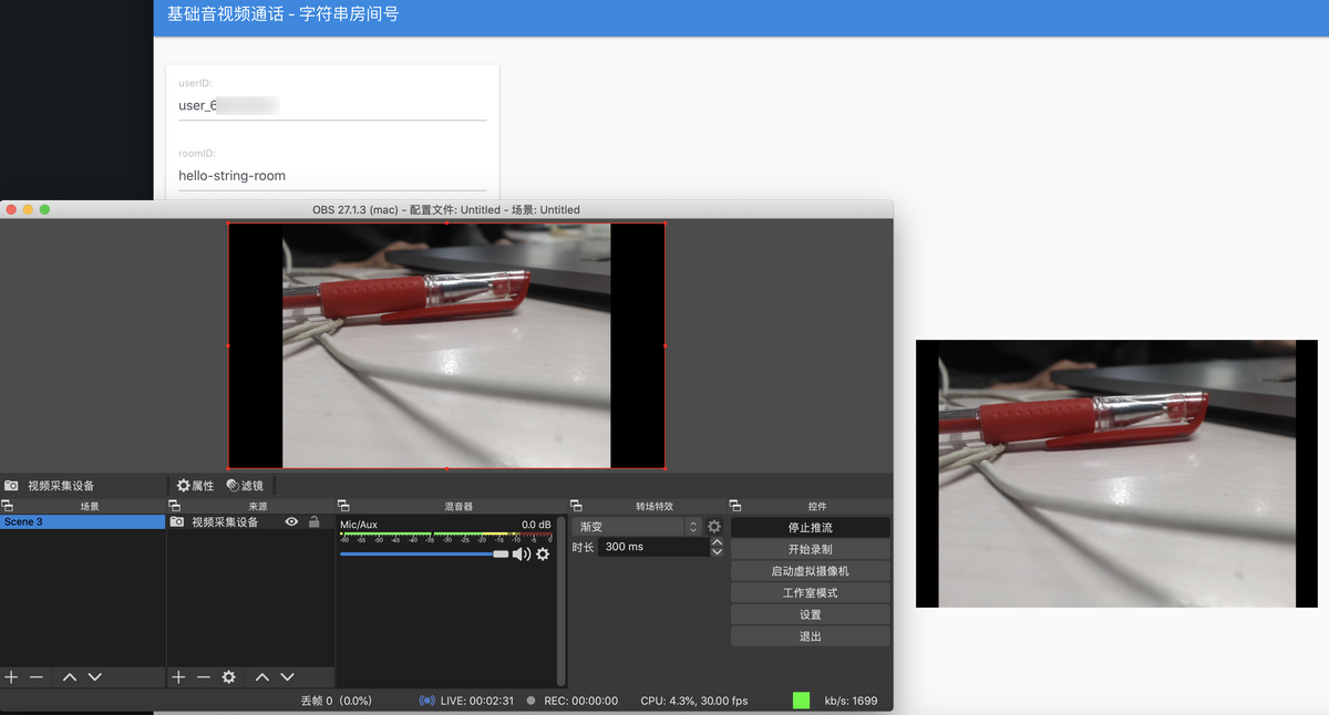 如前面 设置推流参数 所说,TRTC 其他端进房需要使用字符串房间号,Web 端 观看 RTMP 流的效果如下所示,您也可以选择使用其他端观看。