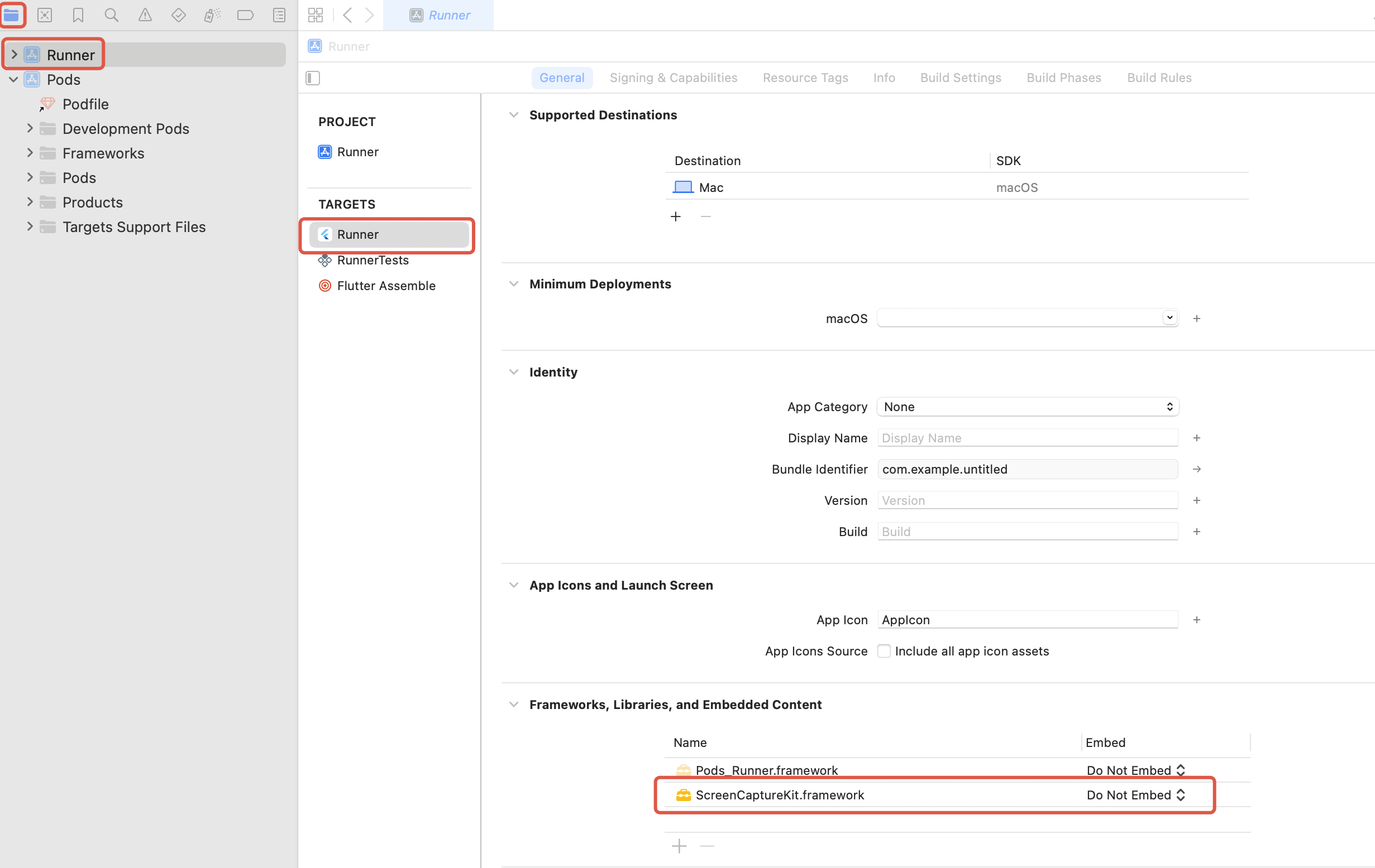 .xcworkspace工程文件后,在 Xcode 的导航栏中点击左侧的 Project Navigator,点击 Runner 并确保在编辑区域选择正确的 TARGETS。General选项卡的 Frameworks, Libraries, and Embedded Content 部分添加 ScreenCaptureKit.framework。