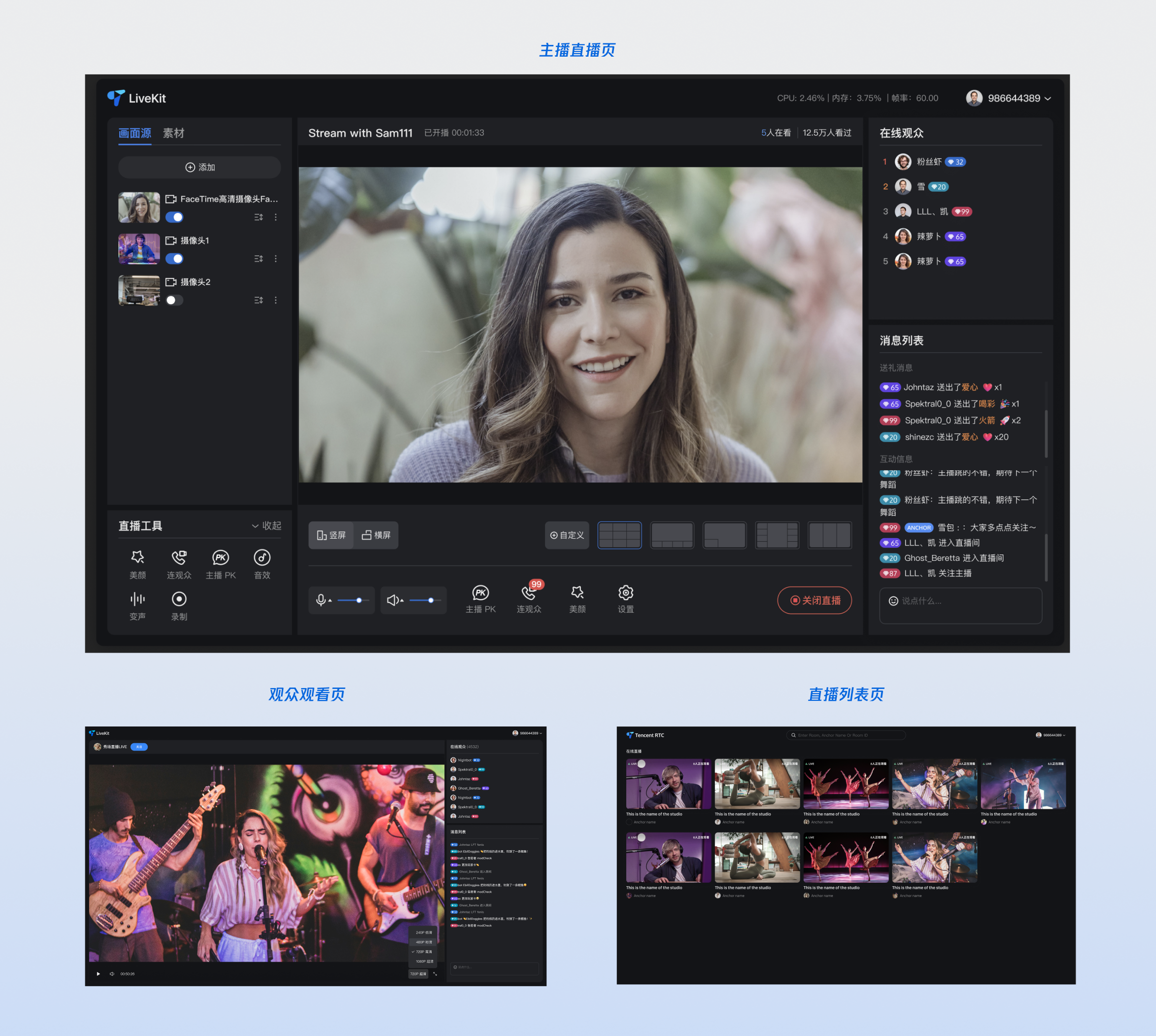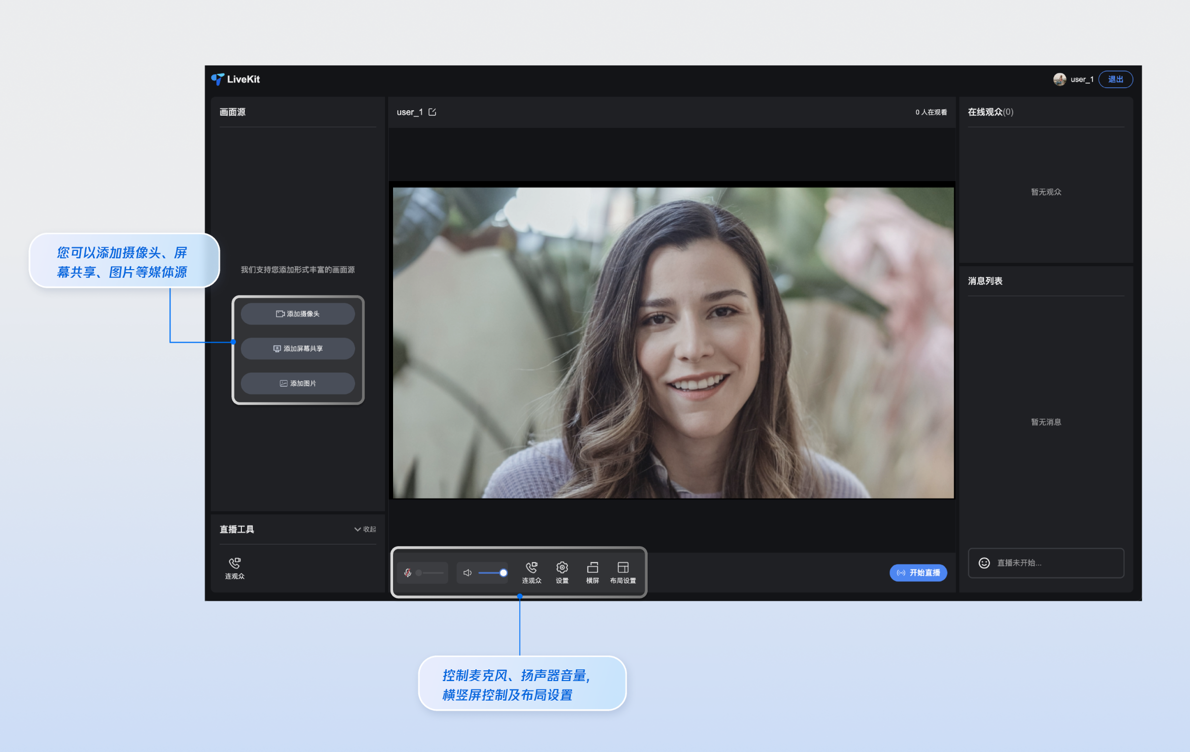 http://localhost:5173/#/live-pusher,您即可进入推流页面。推流页面支持推横屏或者竖屏流功能。另外,左侧素材添加区域支持添加媒体源到页面中,同时您也可以点击下方的连观众按钮,接受或者拒绝观众的连麦申请。