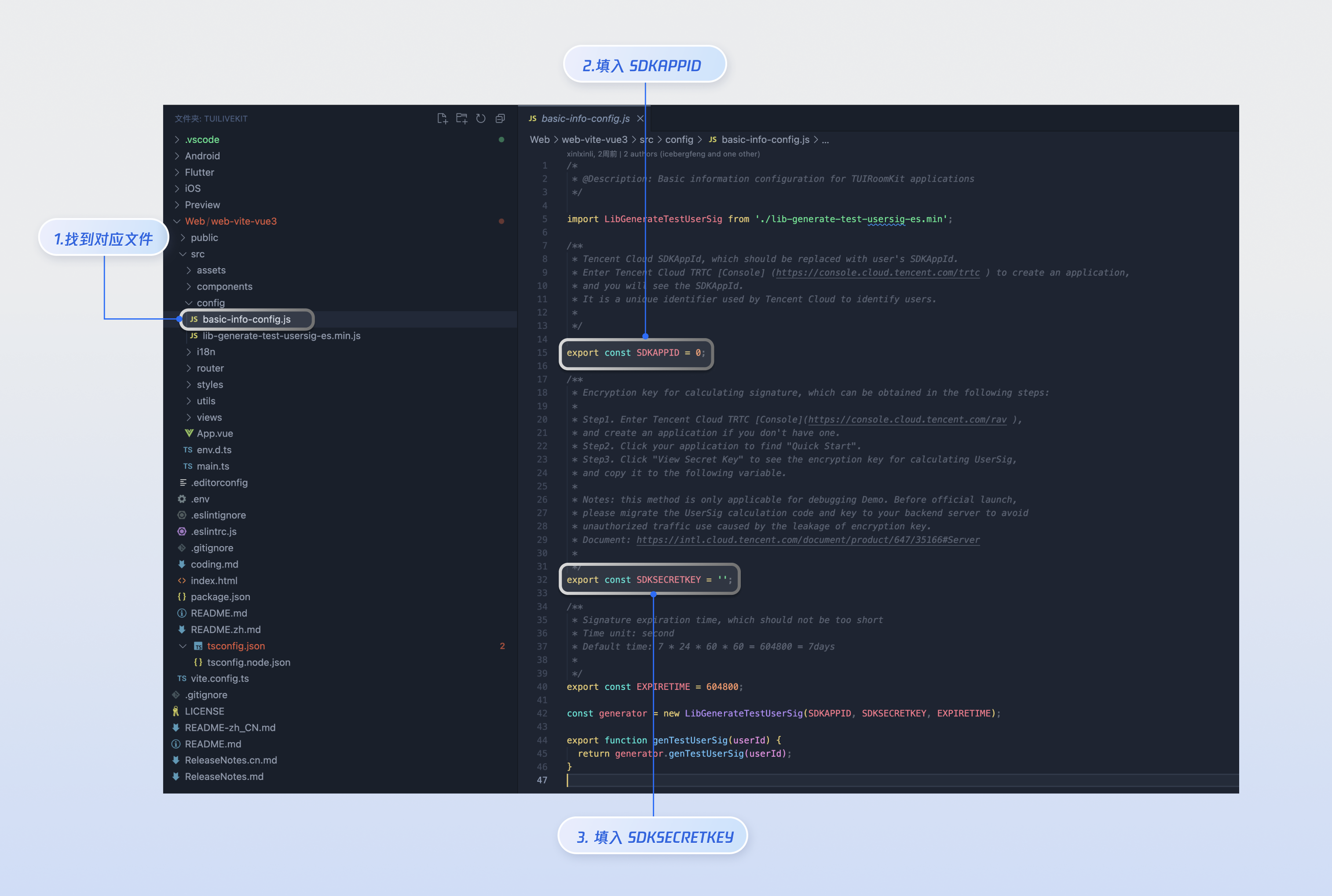 TUILiveKit/Web/web-vite-vue3/src/config/basic-info-config.js 文件,输入准备工作中激活服务时获得的 SDKAppID 和 SDKSecretKey: