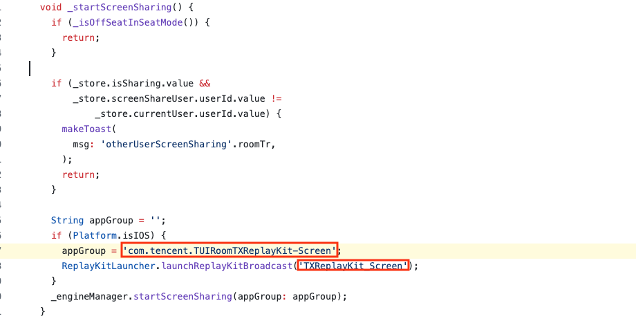 import ReplayKitimport TXLiteAVSDK_ReplayKitExtlet APPGROUP = "group.com.tencent.comm.trtc.demo"class SampleHandler: RPBroadcastSampleHandler, TXReplayKitExtDelegate {let recordScreenKey = Notification.Name.init("TRTCRecordScreenKey")override func broadcastStarted(withSetupInfo setupInfo: [String : NSObject]?) {// User has requested to start the broadcast. Setup info from the UI extension can be supplied but optional.TXReplayKitExt.sharedInstance().setup(withAppGroup: APPGROUP, delegate: self)}override func broadcastPaused() {// User has requested to pause the broadcast. Samples will stop being delivered.}override func broadcastResumed() {// User has requested to resume the broadcast. Samples delivery will resume.}override func broadcastFinished() {// User has requested to finish the broadcast.TXReplayKitExt.sharedInstance() .finishBroadcast()}func broadcastFinished(_ broadcast: TXReplayKitExt, reason: TXReplayKitExtReason) {var tip = ""switch reason {case TXReplayKitExtReason.requestedByMain:tip = "屏幕共享已结束"breakcase TXReplayKitExtReason.disconnected:tip = "应用断开"breakcase TXReplayKitExtReason.versionMismatch:tip = "集成错误(SDK 版本号不相符合)"breakdefault:break}let error = NSError(domain: NSStringFromClass(self.classForCoder), code: 0, userInfo: [NSLocalizedFailureReasonErrorKey:tip])finishBroadcastWithError(error)}override func processSampleBuffer(_ sampleBuffer: CMSampleBuffer, with sampleBufferType: RPSampleBufferType) {switch sampleBufferType {case RPSampleBufferType.video:// Handle video sample bufferTXReplayKitExt.sharedInstance() .sendVideoSampleBuffer(sampleBuffer)breakcase RPSampleBufferType.audioApp:// Handle audio sample buffer for app audiobreakcase RPSampleBufferType.audioMic:// Handle audio sample buffer for mic audiobreak@unknown default:// Handle other sample buffer typesfatalError("Unknown type of sample buffer")}}}.