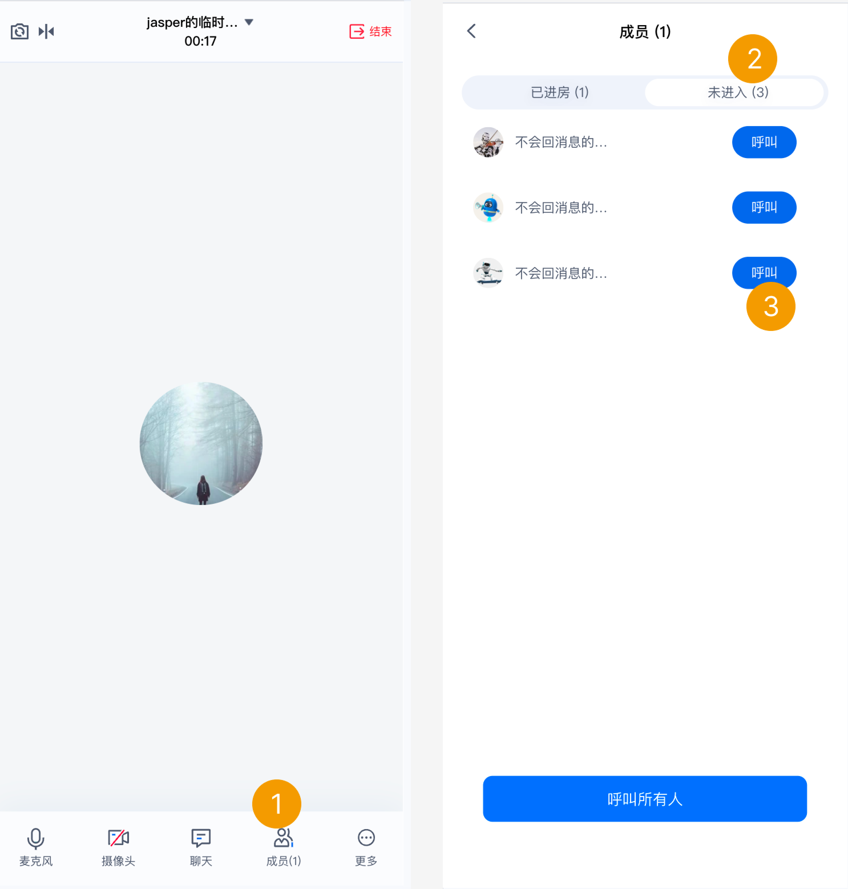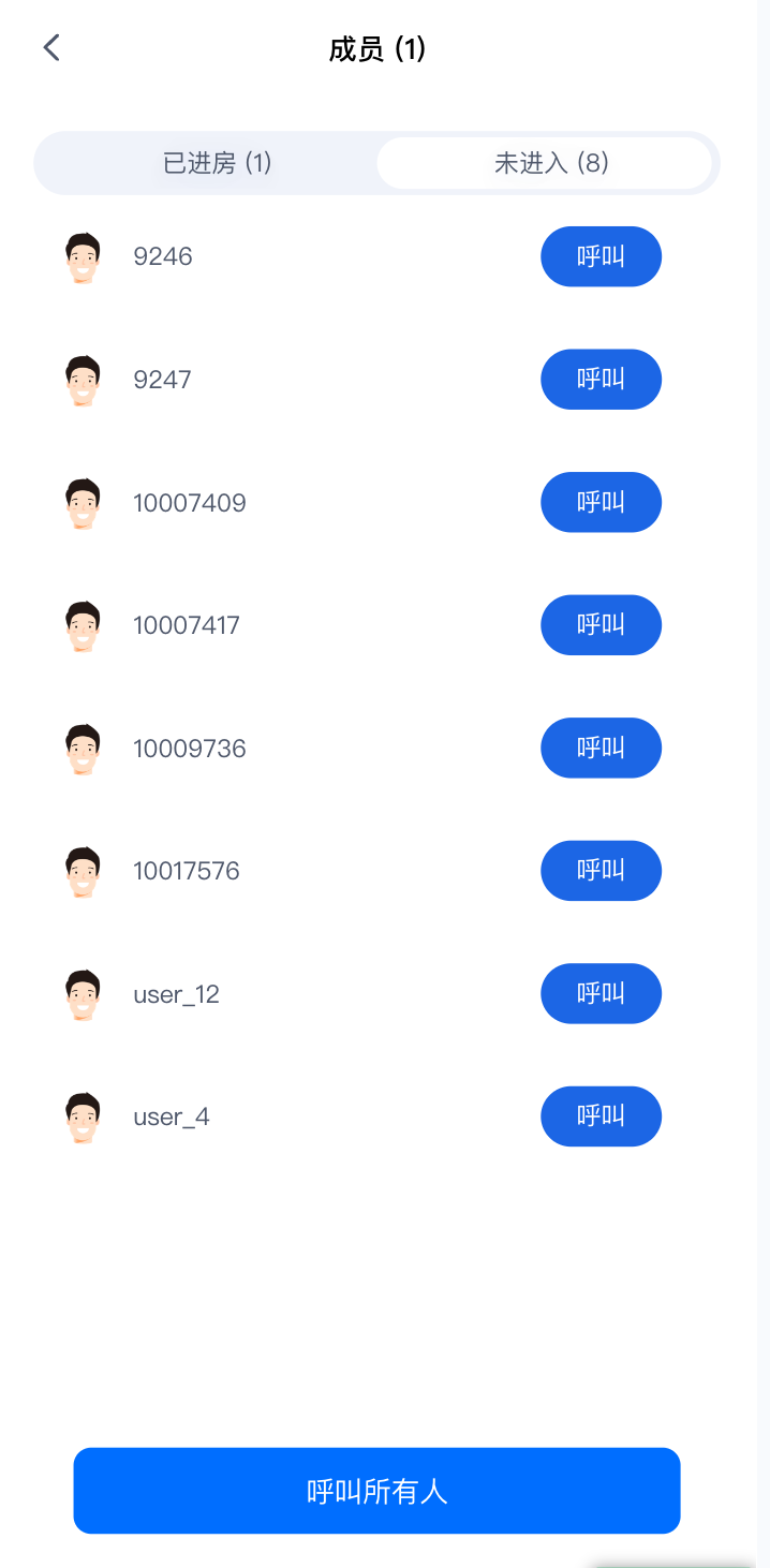 当您在会议中时,您可以通过如下两种方式对未进房的用户进行呼叫: