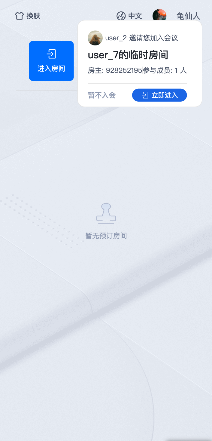 当您在应用内收到呼叫时,会弹出如下图所示的通知,您可以选择加入房间,或暂不进入。