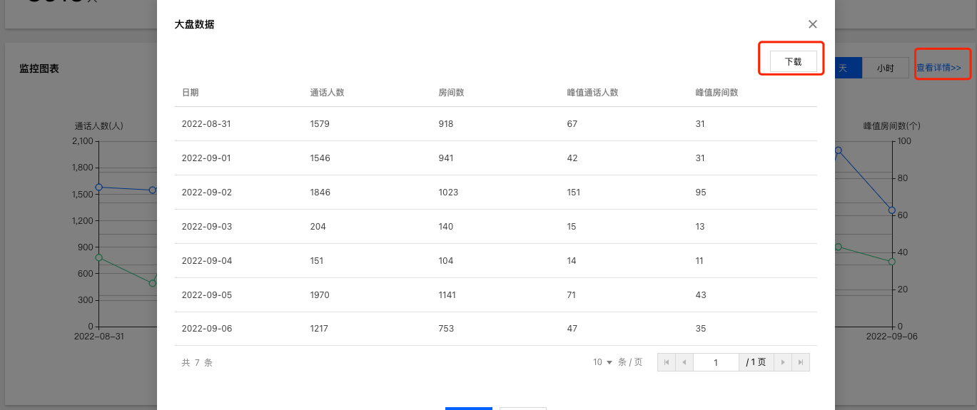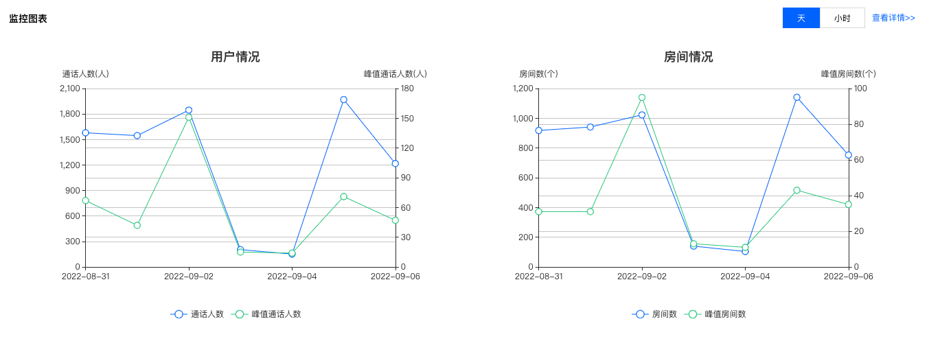大盘数据:支持查看某一段时间内的通话人数、房间数、峰值通话人数和峰值房间数,可快速了解运营规模情况。