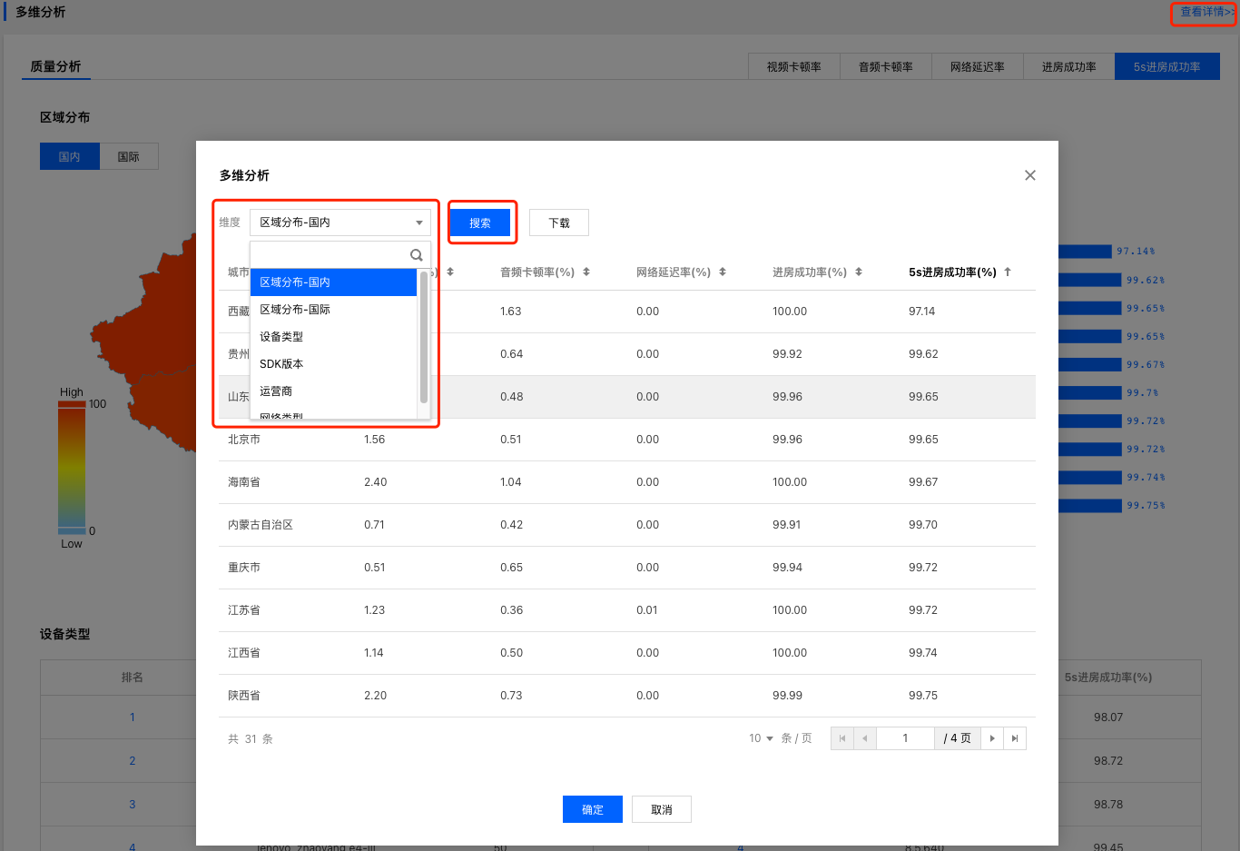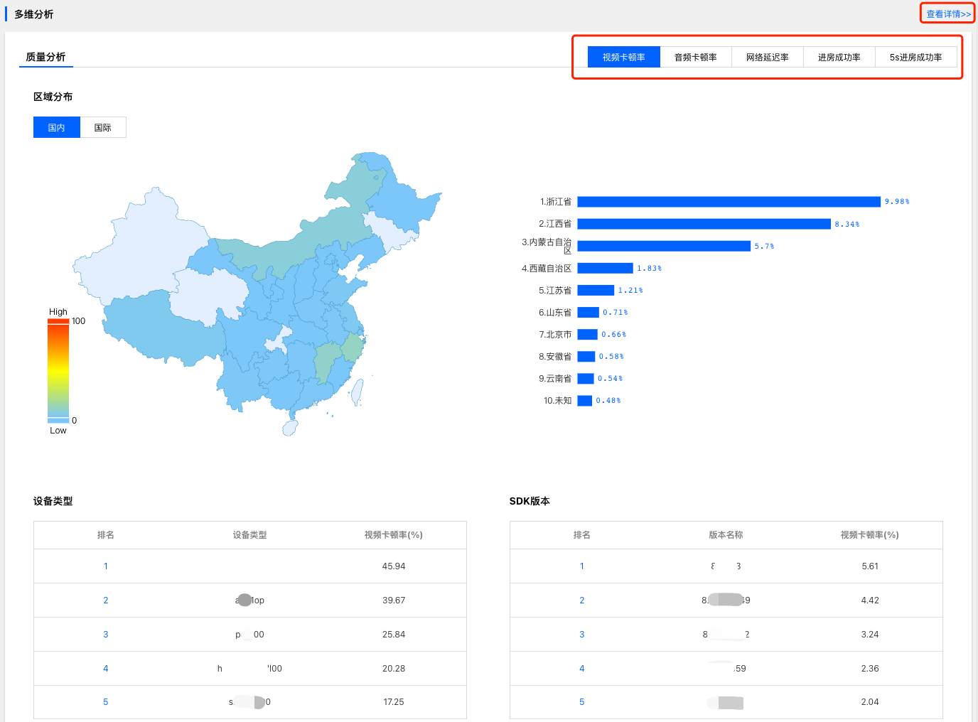 质量分析:多维分析下的质量分析提供了多个维度下(地域,SDK版本,网络类型)的通话质量指标的查询功能,可以根据想要了解的质量指标,在对应的维度模块下进行查看,同时可以单击查看详情,查看全部明细数据,如下图。