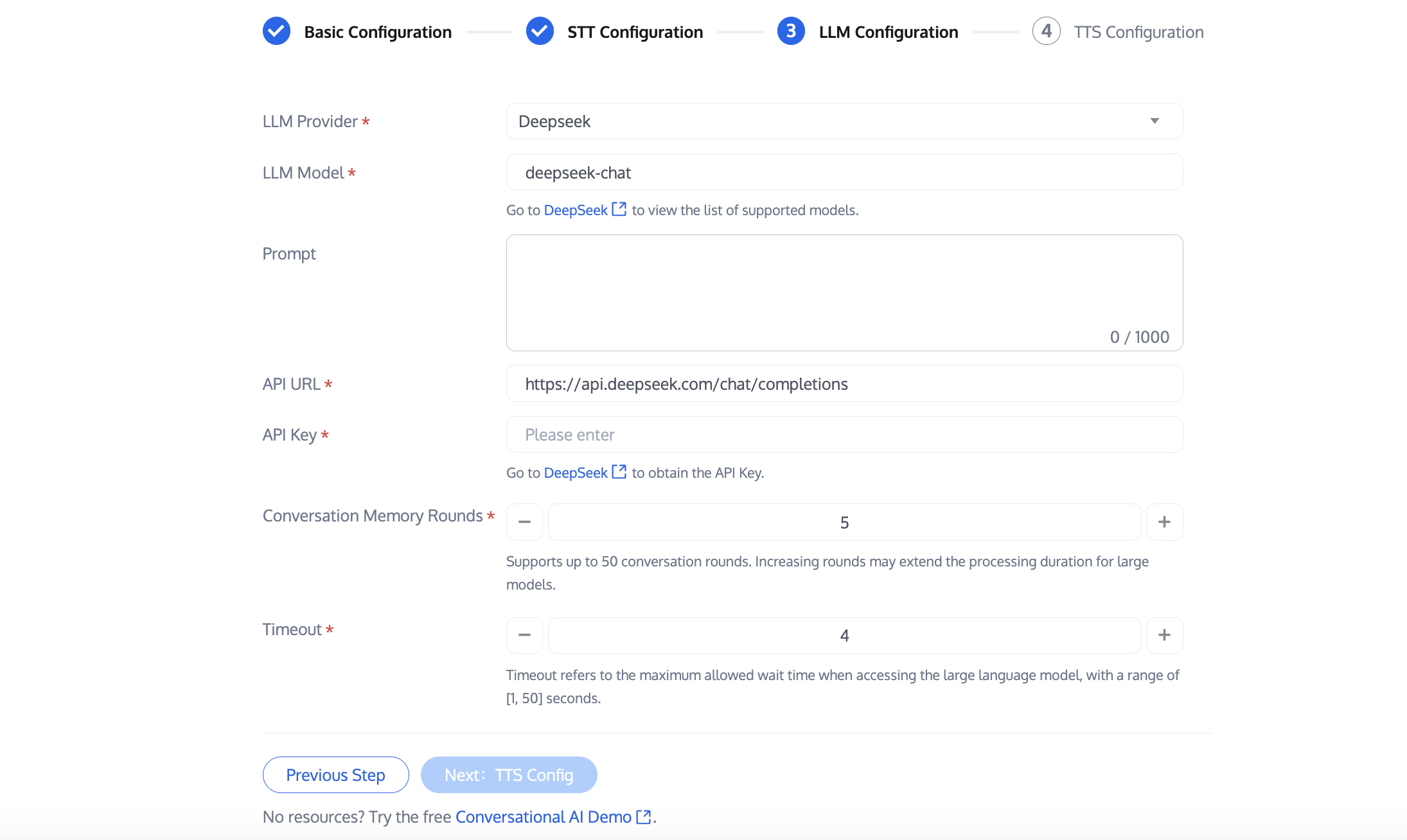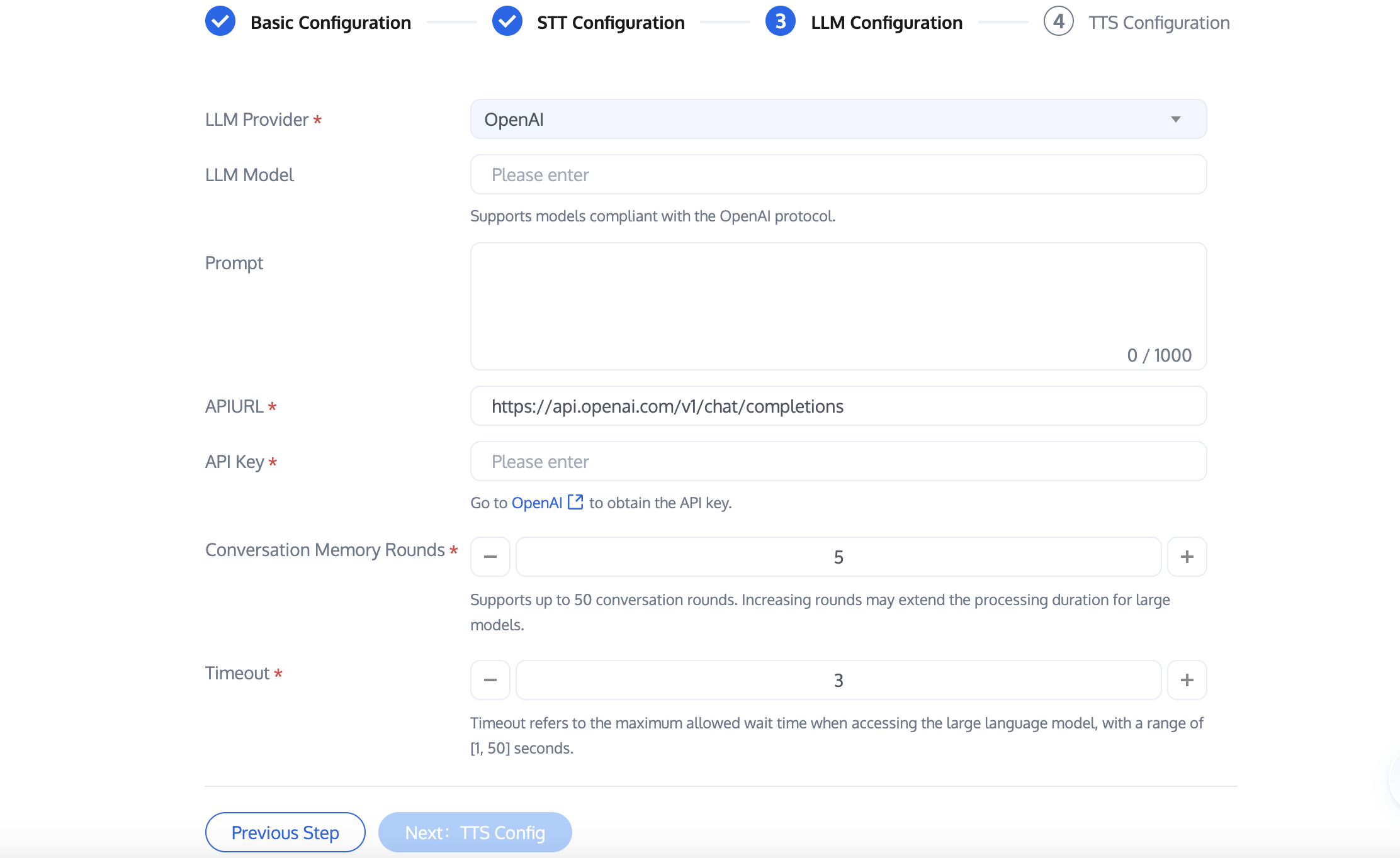 在本页面需要您自行申请第三方资源进行配置:LLM 提供方支持 OpenAI、Deepseek、Minimax、Tencent Hunyuan、Coze 和 Dify。配置完成后单击 Next 。
