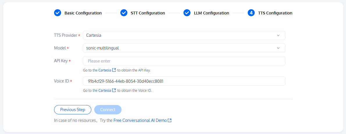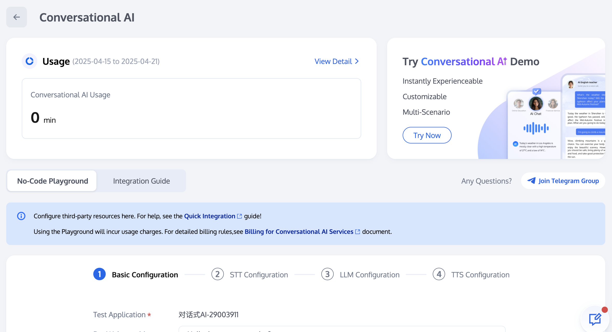 Playground配置需要您自备LLM和TTS资源,如仅体验效果,可单击 Try Demo 查看。 STEP 1:基础配置