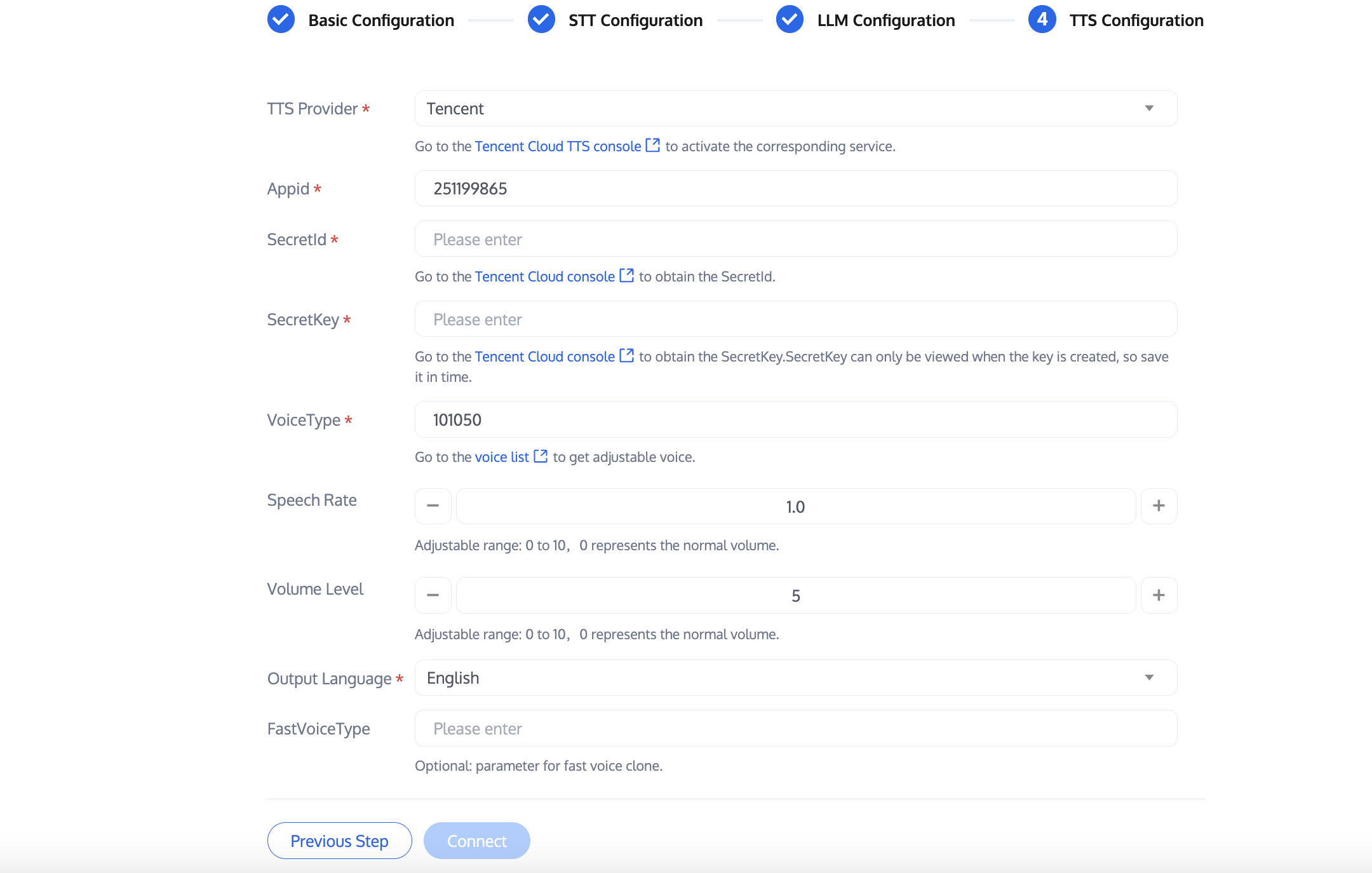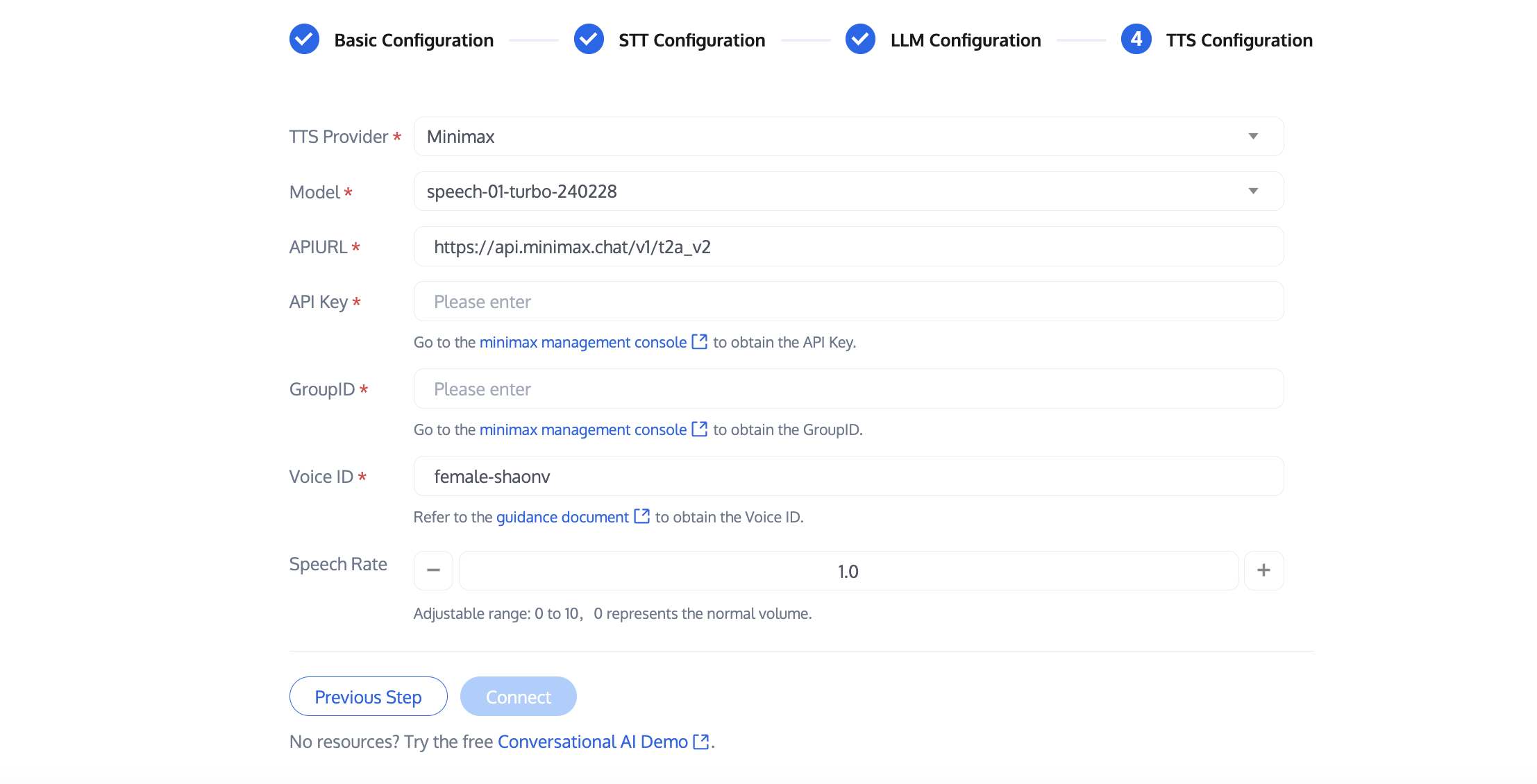 LLM 提供方选择 Minimax 时,我们提供了默认参数,您根据需求进行微调;LLM 模型可下拉选项自由选择,API Key 可前往 Minimax 管理后台 获取。 LLM 提供方选择混元时,其他配置我们提供了默认参数,您根据需求进行微调;LLM 模型可下拉选项自由选择,API Key 可前往 API 密匙管理 获取。 LLM 提供方选择 Coze 时,其他配置我们提供了默认参数,您根据需求进行微调;API Key 可前往 Coze 获取 Secret token,参见 指引文档 获取 BotId。 LLM 提供方选择 Dify 时,其他配置我们提供了默认参数,您根据需求进行微调;API Key 可前往 Dify 获取。 STEP 4:TTS 语音合成配置