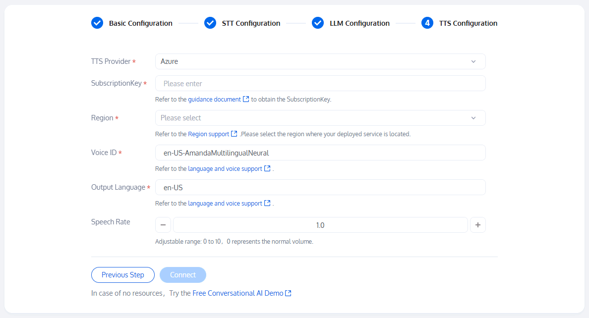 在 TTS 语音合成配置页面:TTS 提供方支持 Cartesia、Elevenlabs、 Tencent、Minimax、Azure 和 自定义。配置完成后单击 Connect ,若配置信息无误将进入开始对话页面。