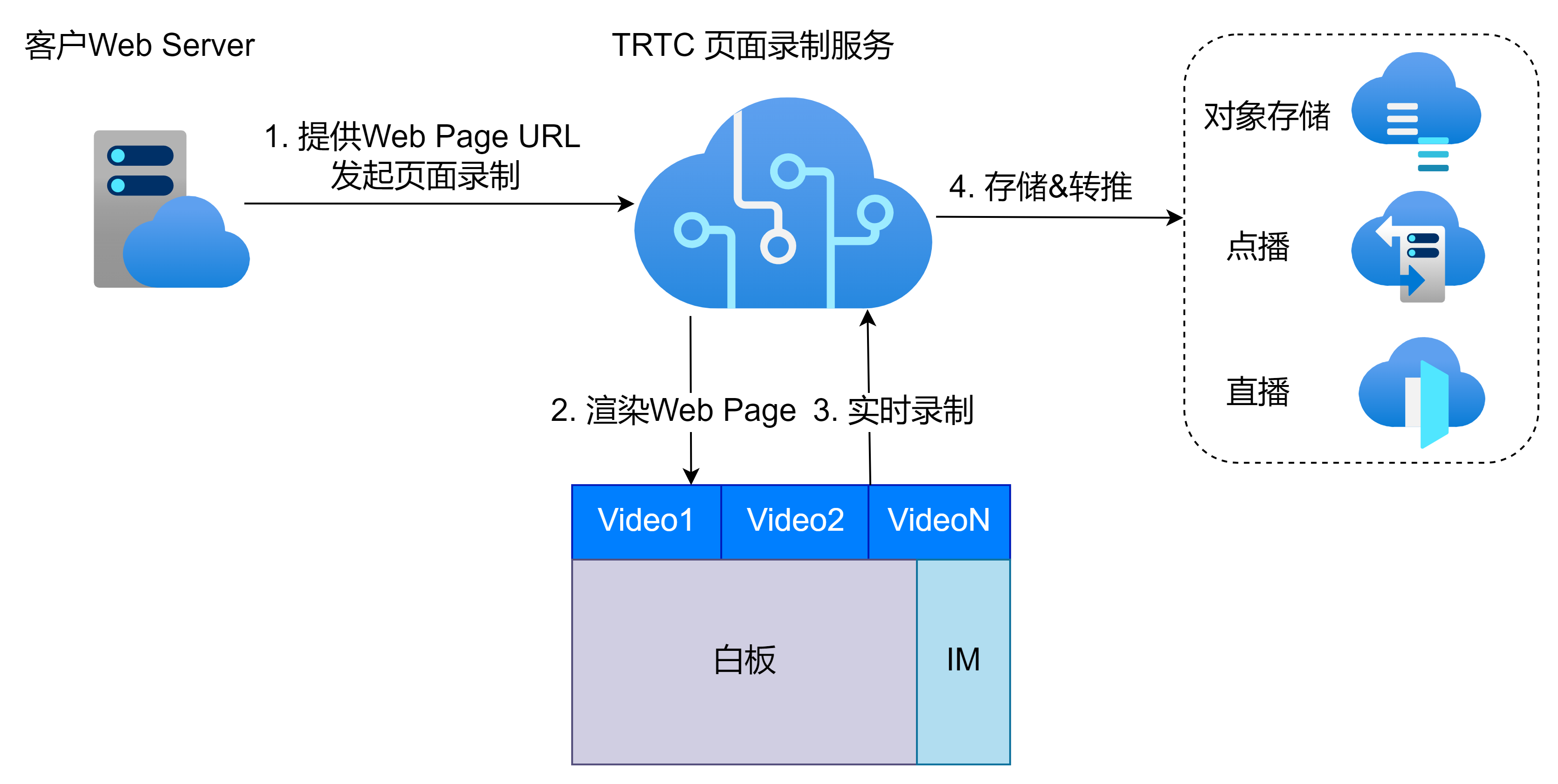 1. 客户可以通过云 API 发起页面录制请求,在该请求中指定待录制的 Web Page 的 URL,以及录制存储参数。