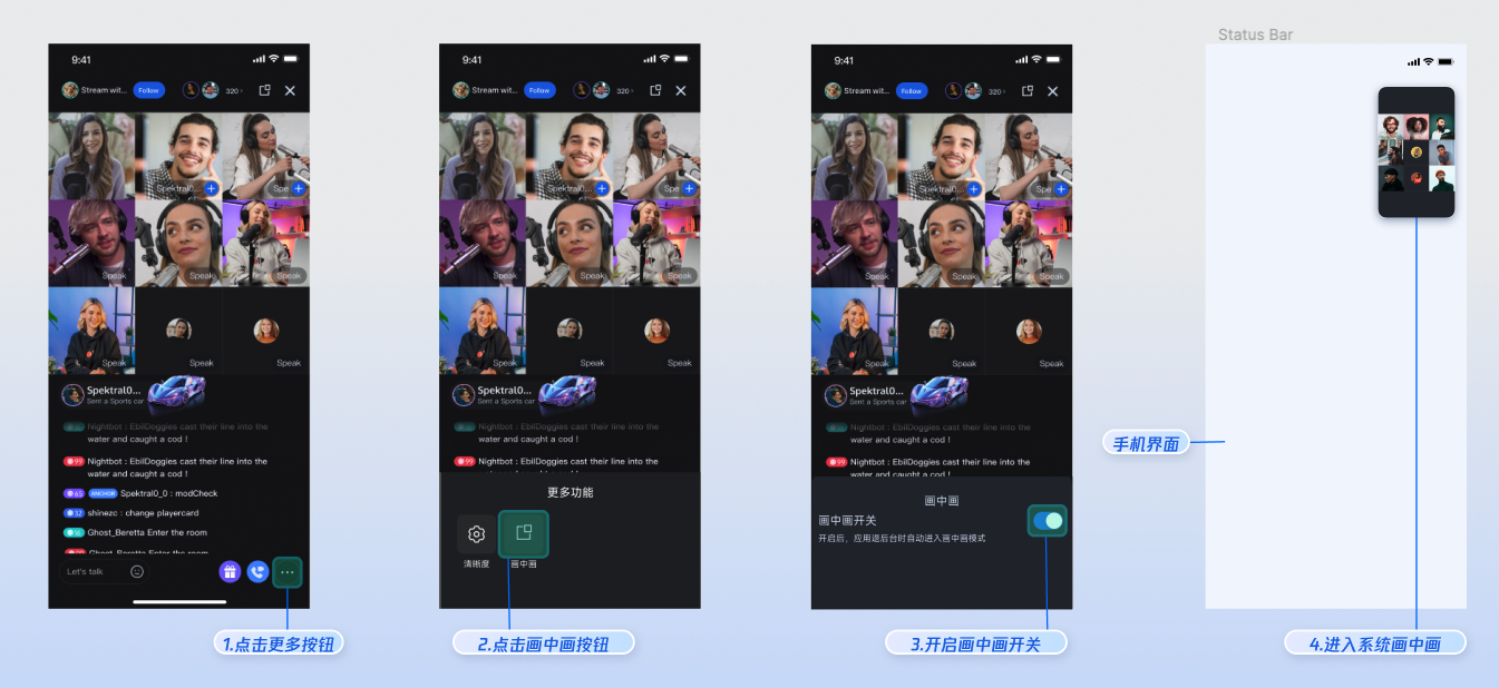 TUILiveRoomAudienceOverlay 是支持浮窗模式的观看页面。在观看直播期间,可以切换到应用内和应用外(即画中画) 2 种场景的浮窗模式。TUILiveRoomAudienceOverlay 是基于 Flutter 官方 API Overlay 和原生画中画实现的,具体接入流程如下:import 'package:tencent_live_uikit/tencent_live_uikit.dart';// 跳转到观看页面Navigator.push(context, MaterialPageRoute(builder: (BuildContext context) {final roomId = "test_live_room_id";return TUILiveRoomAudienceOverlay(roomId: roomId);}));