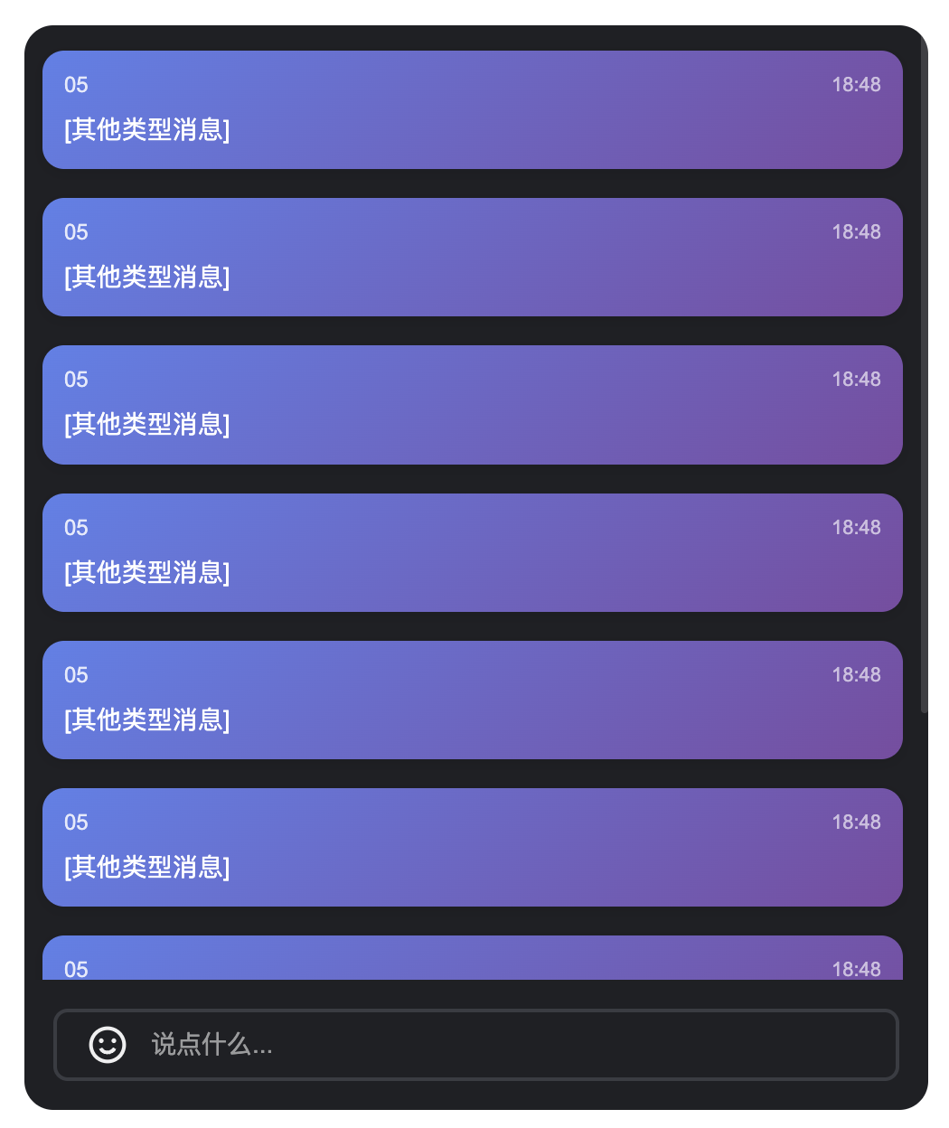 //MyCustomMessage.vue<template><div class="custom-message"><div class="message-header"><span class="user-name">{{ getUserName(message) }}</span><span class="message-time">{{ formatTime(message.time) }}</span></div><div class="message-content">{{ getMessageText(message) }}</div></div></template><script setup lang="ts">interface SimpleMessage {id: string;from: string;nick?: string;nameCard?: string;time: number;type: string;content: string;avatar?: string;}interface Props {message: SimpleMessage;isLastInChunk?: boolean;}const props = defineProps<Props>();const formatTime = (timestamp: number) => {return new Date(timestamp * 1000).toLocaleTimeString('zh-CN', {hour: '2-digit',minute: '2-digit'});};const getUserName = (message: SimpleMessage) => {return message.nameCard || message.nick || message.from || '匿名用户';};const getMessageText = (message: SimpleMessage) => {if (message.type === 'text') {return message.content || '';} else if (message.type === 'image') {return '[图片消息]';} else if (message.type === 'emoji') {return '[表情消息]';}return '[其他类型消息]';};</script><style scoped>.custom-message{background:linear-gradient(135deg,#667eea 0%,#764ba2 100%);color:white;padding:12px;border-radius:12px;margin:4px 0;box-shadow:0 2px 8px rgba(0,0,0,0.1);transition:transform 0.2s ease}.custom-message:hover{transform:translateY(-2px)}.message-header{display:flex;justify-content:space-between;align-items:center;margin-bottom:8px;font-size:12px;opacity:0.9}.user-name{font-weight:500;max-width:120px;overflow:hidden;text-overflow:ellipsis;white-space:nowrap}.message-time{font-size:11px;opacity:0.7}.message-content{font-size:14px;line-height:1.4;word-break:break-word}</style>// 在 弹幕消息组件 中使用<template><BarrageList :Message="MyCustomMessage" /></template><script setup lang="ts">import MyCustomMessage from "./MyCustomMessage.vue";</script>