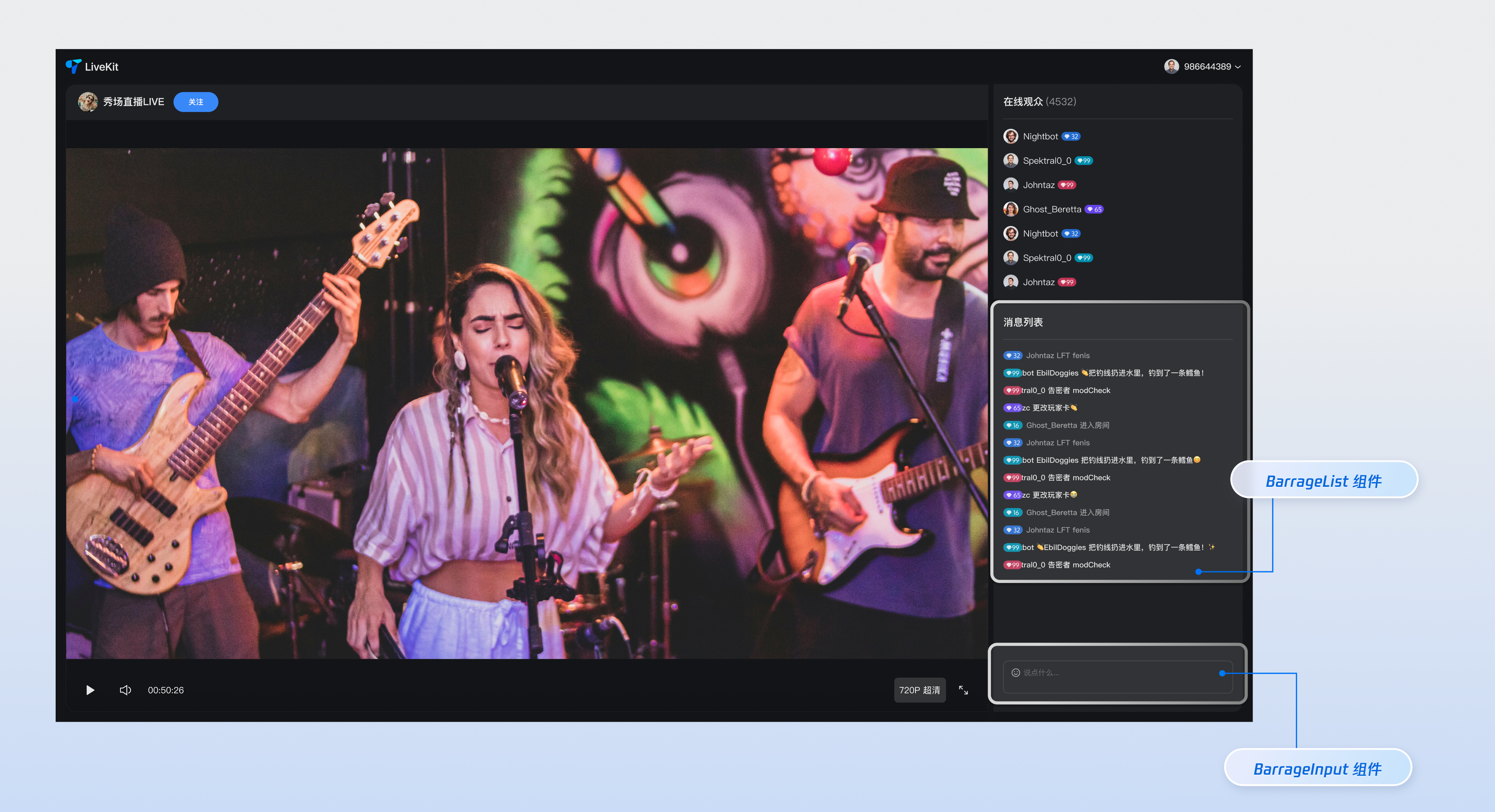 弹幕消息组件(BarrageList) | 负责实时展示和管理弹幕消息流的组件,提供消息列表渲染、时间聚合、用户交互和响应式适配等完整的消息展示解决方案。 |