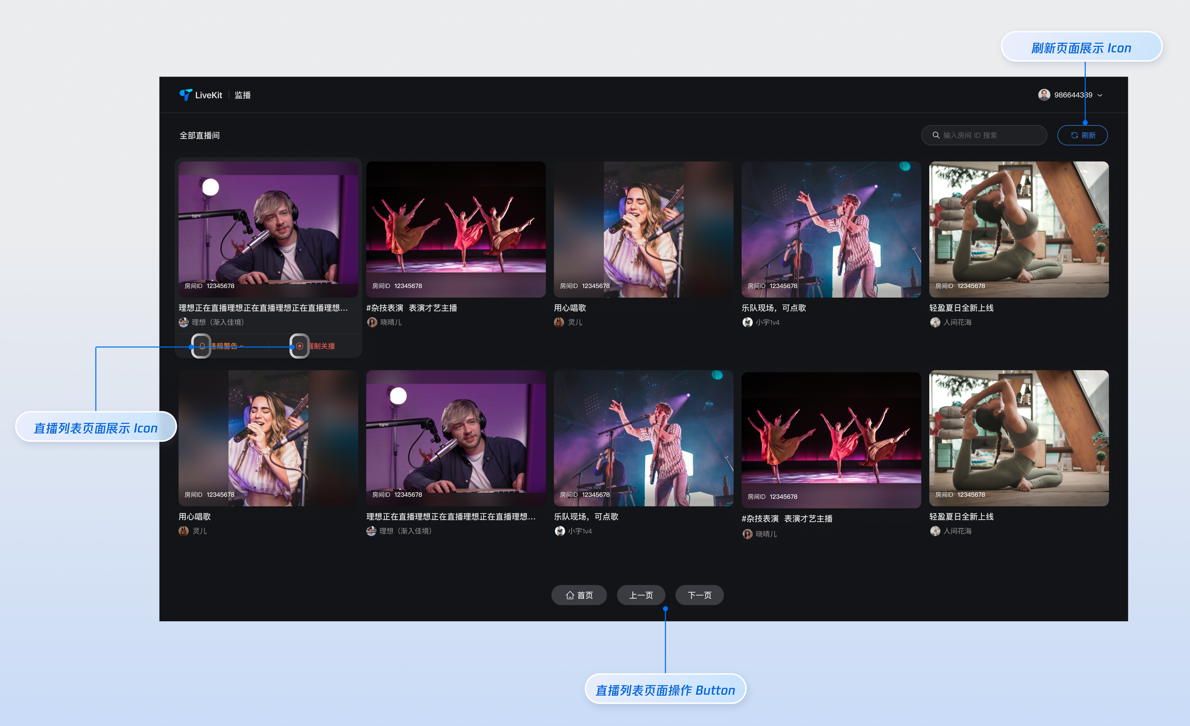 一键查看详情 | 单击任意直播间窗口,快速进入详情页,查看主播信息等关键信息。 |