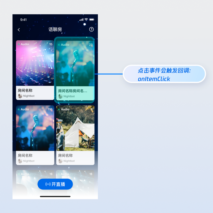 OnItemClickListener 回调处理点击事件,您只需在直播列表瀑布流视图中实现 OnItemClickListener 来响应用户的点击事件,并在 onItemClick 中实现跳转进入观众观看页的功能,观众观看页实现可参考 观众观看 。