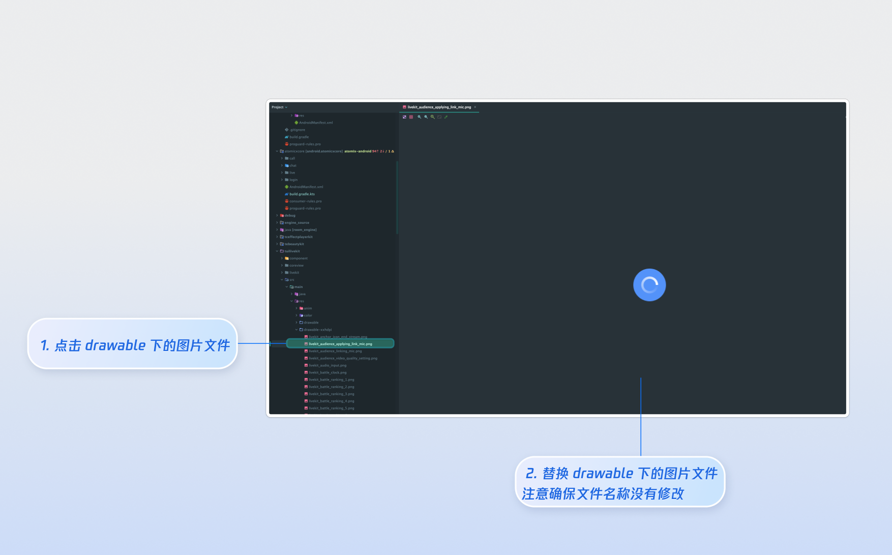 TUILiveKit 使用 drawable 资源来管理 UI 所需的图片资源。您可以直接在 tuilivekit 模块的 res/drawable 目录下替换同名图片资源,以实现图标替换。