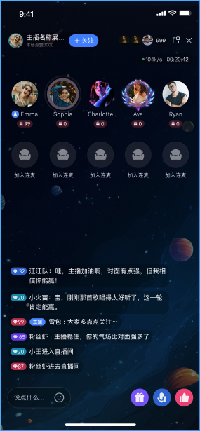 TUILiveKit语聊房为纯音频直播场景提供了开箱即用的全功能界面。它支持快速搭建观众观看、上麦互动所需的核心能力,让您无需关注复杂的 UI 与麦位管理逻辑。收听直播 | 上麦互动 | 直播间信息 | 观众互动 |