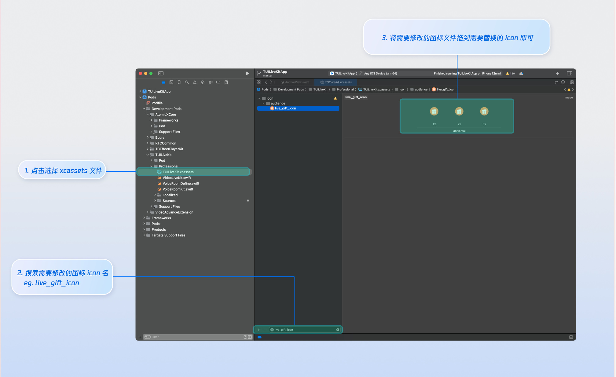 TUILiveKit.xcassets 管理 UI 所需的图片资源,您可以借助 Xcode 图形化工具快速替换图标。