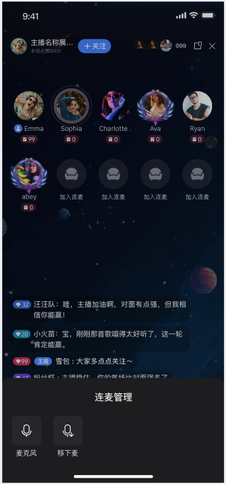 TUILiveKit语聊房为纯音频直播场景提供了开箱即用的全功能界面。它支持快速搭建观众观看、上麦互动所需的核心能力,让您无需关注复杂的 UI 与麦位管理逻辑。收听直播 | 上麦互动 | 直播间信息 | 观众互动 |