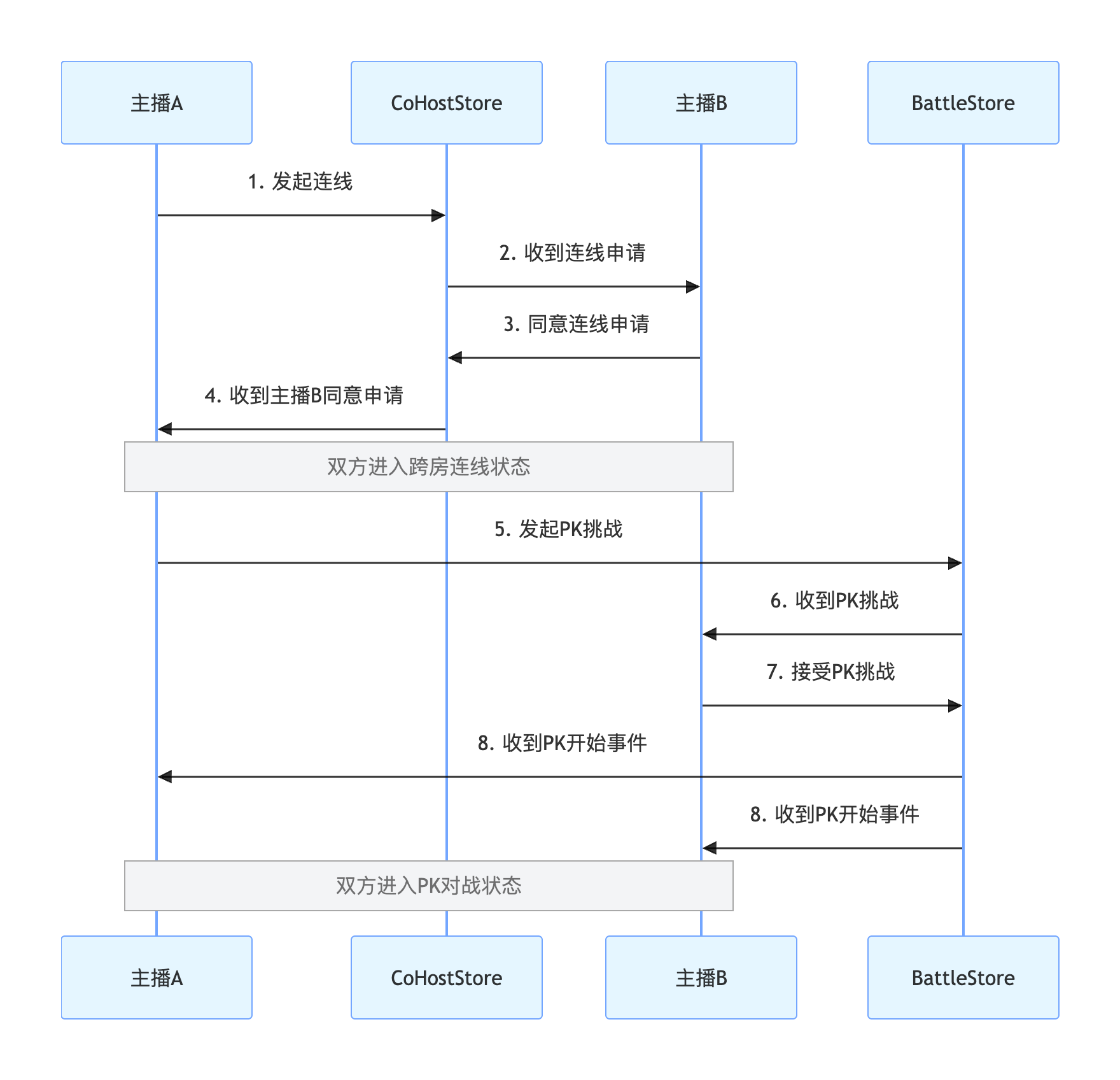 BattleStore | 主播 PK 对战:发起 PK(配置时长 / 对手),管理 PK 状态(开始 / 结束),同步分数,监听对战结果。 |