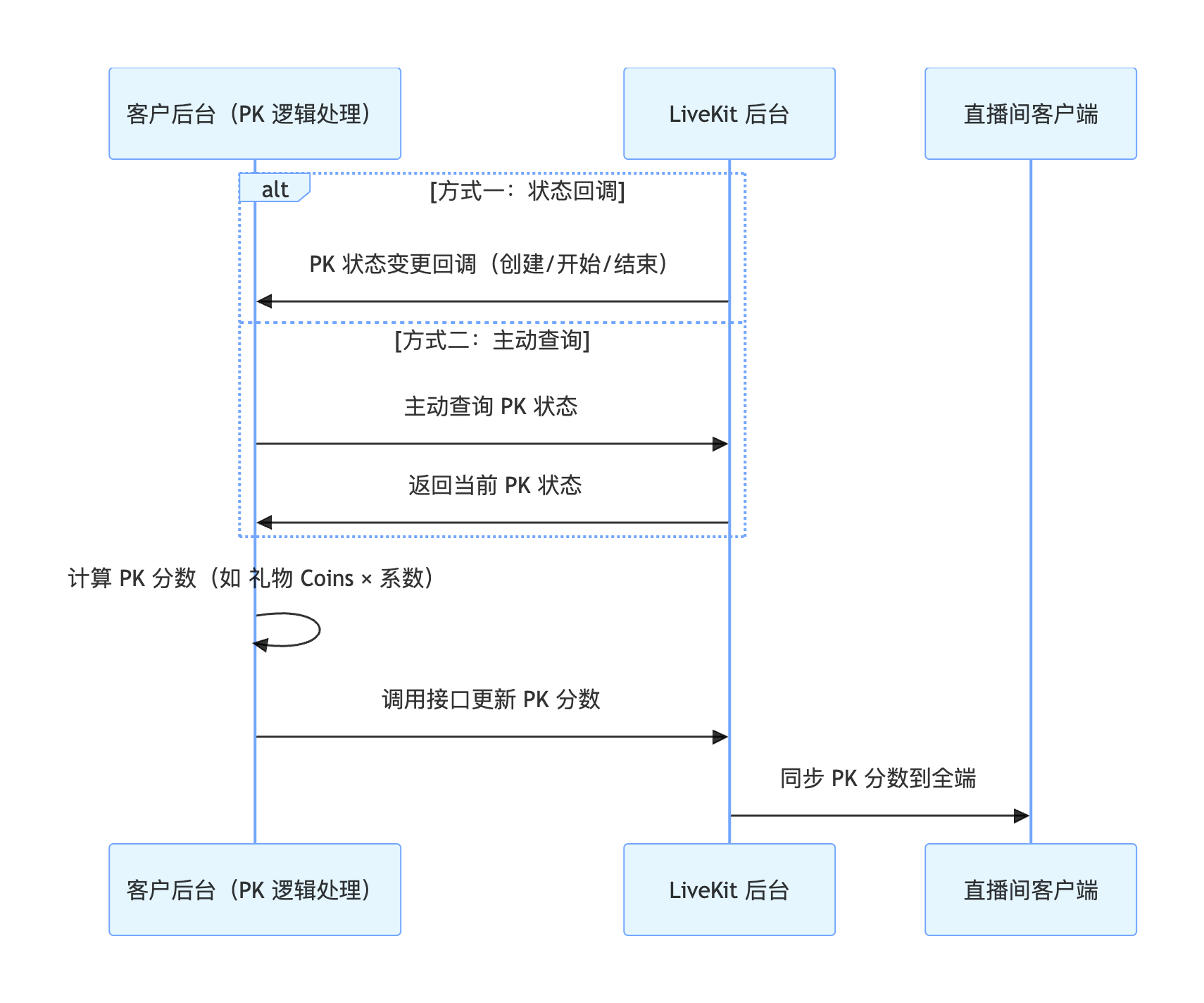 requestBattle 方法。// AnchorAViewController 的一部分private lazy var battleStore: BattleStore = BattleStore.create(liveID: self.liveId)func startPK(with opponentUserId: String) {var config = BattleConfig(duration: 300) // PK持续5分钟battleStore.requestBattle(config: config, userIDList: [opponentUserId], timeout: 30.0, completion: nil)}