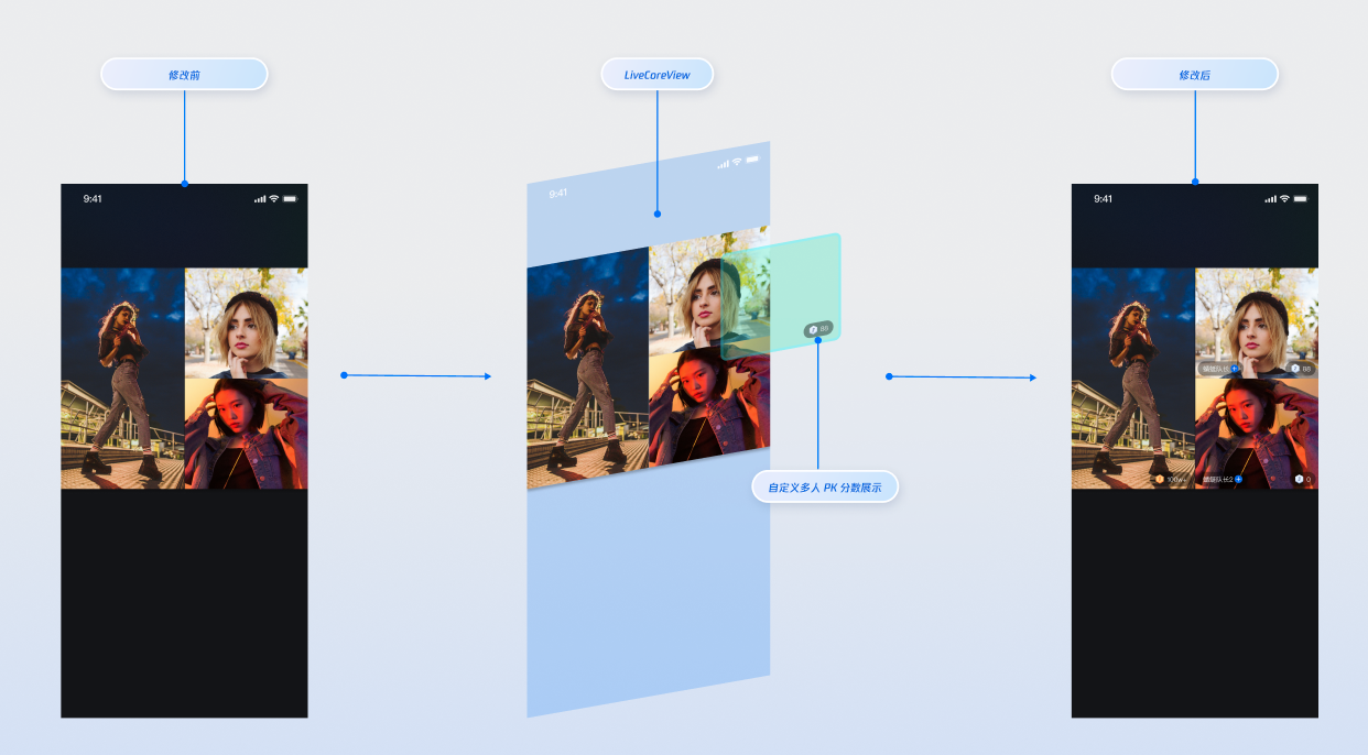 LiveCoreView.VideoViewDelegate 协议提供的“插槽”能力,在视频流画面上添加自定义视图,用于显示昵称、头像、PK 进度条等信息,或在主播关闭摄像头时提供占位图,以优化视觉体验。