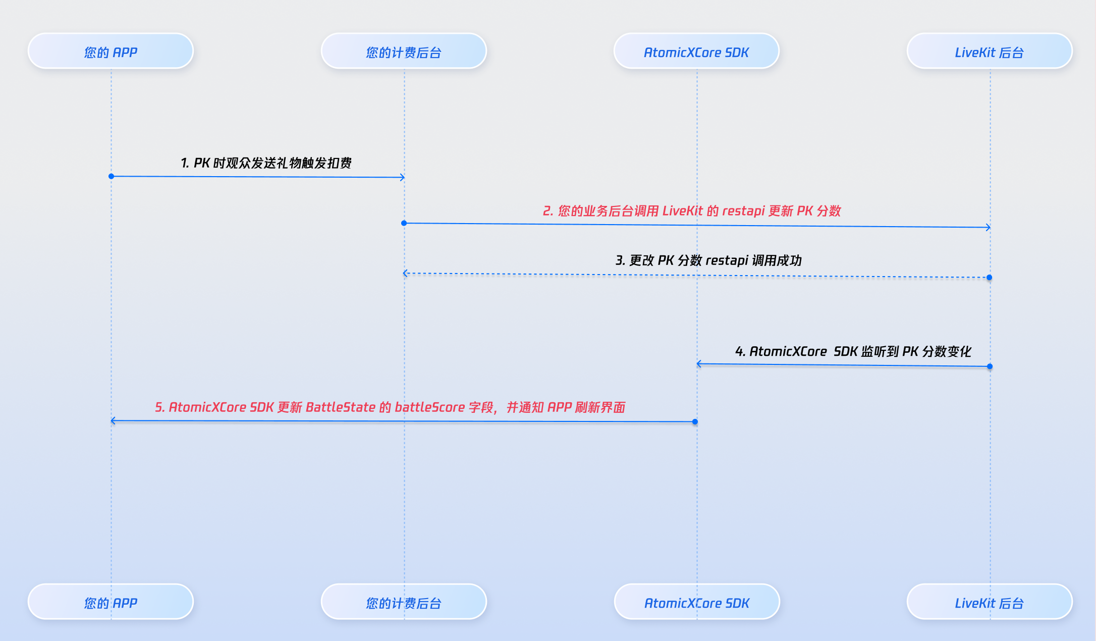 BattleListener 的 onBattleStarted 回调之后,可以在 UI 上渲染 PK 进度条。needResponse 设置为 false, 则当邀请成功发出后,会自动进入 PK 状态。needResponse 设置为 true,则当被邀请的所有对端主播都调用 BattleStore 的 acceptBattle 接口同意后进入 PK 状态。needResponse 设置为 true,若对端主播同意 PK,则已加入 PK 的主播会收到 BattleListener 的 onUserJoinBattle 回调。BattleListener 的 onBattleStarted 回调。