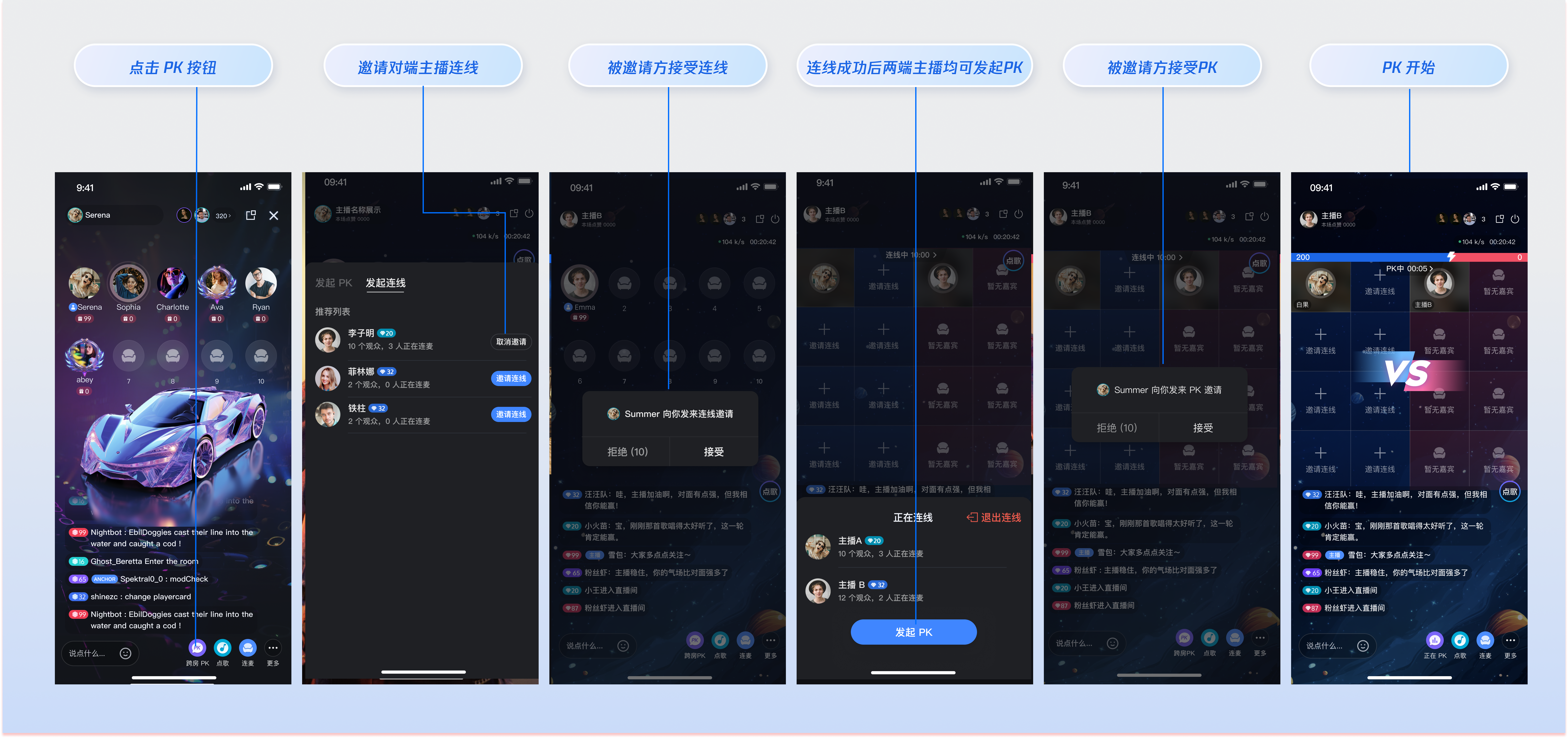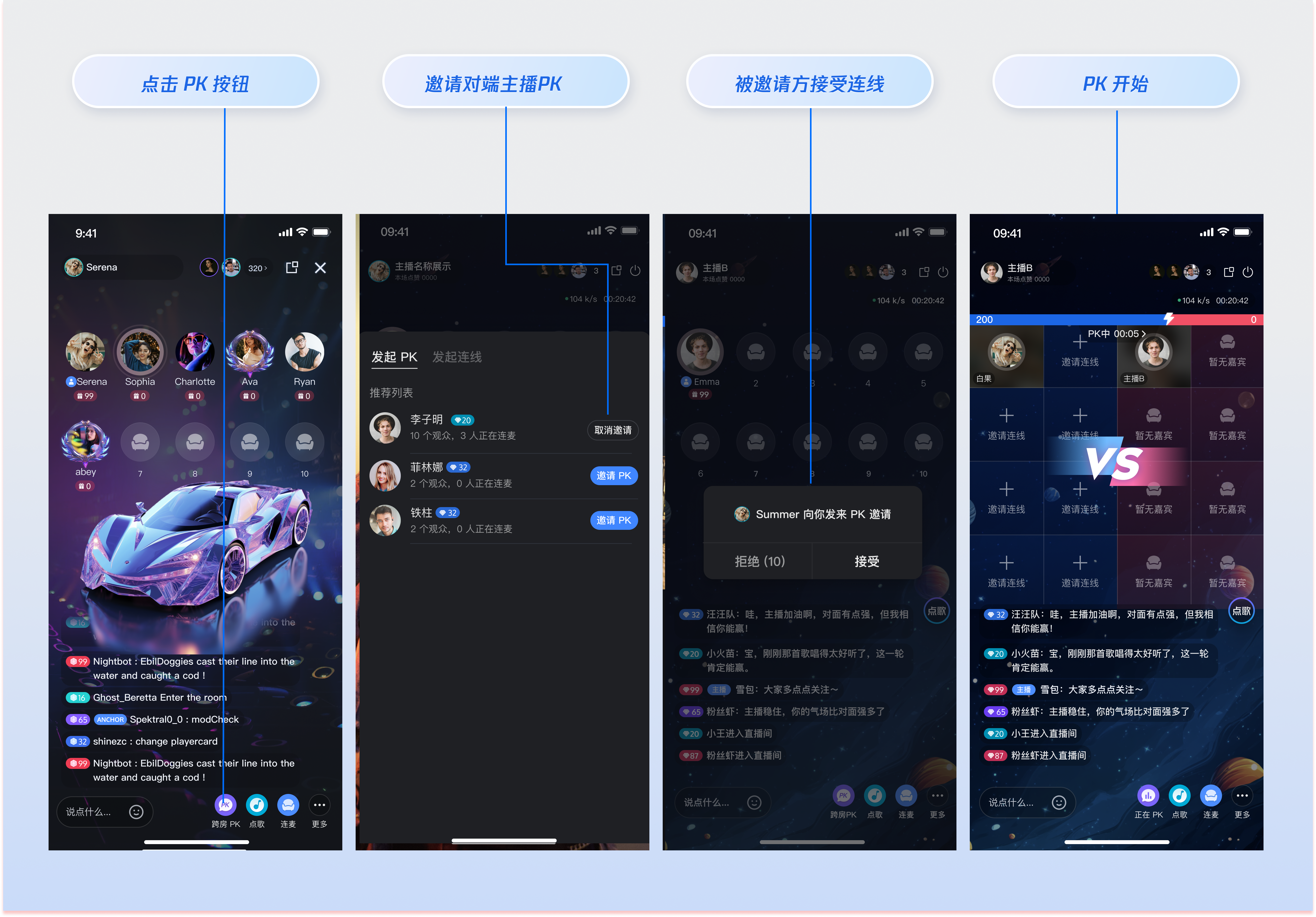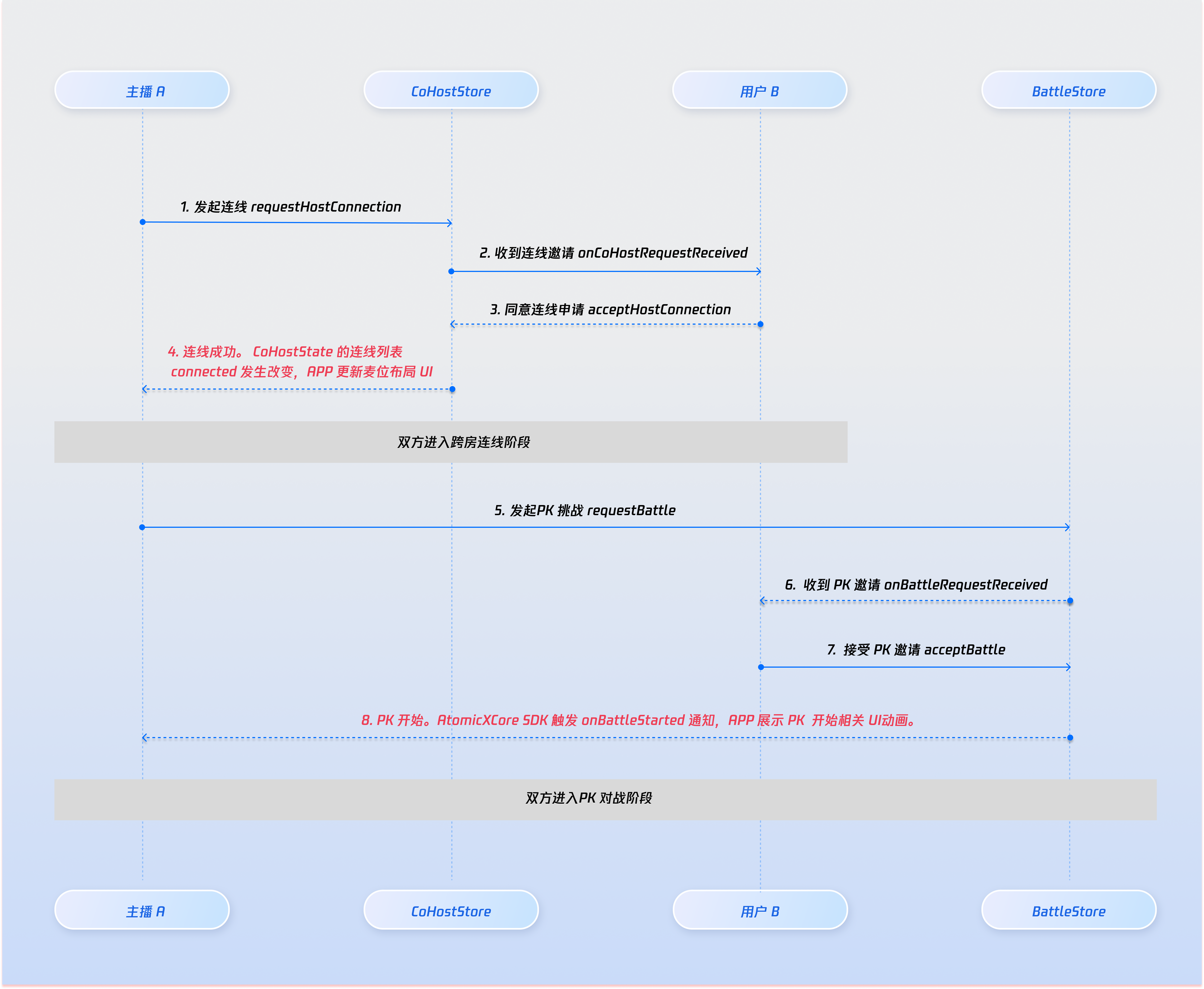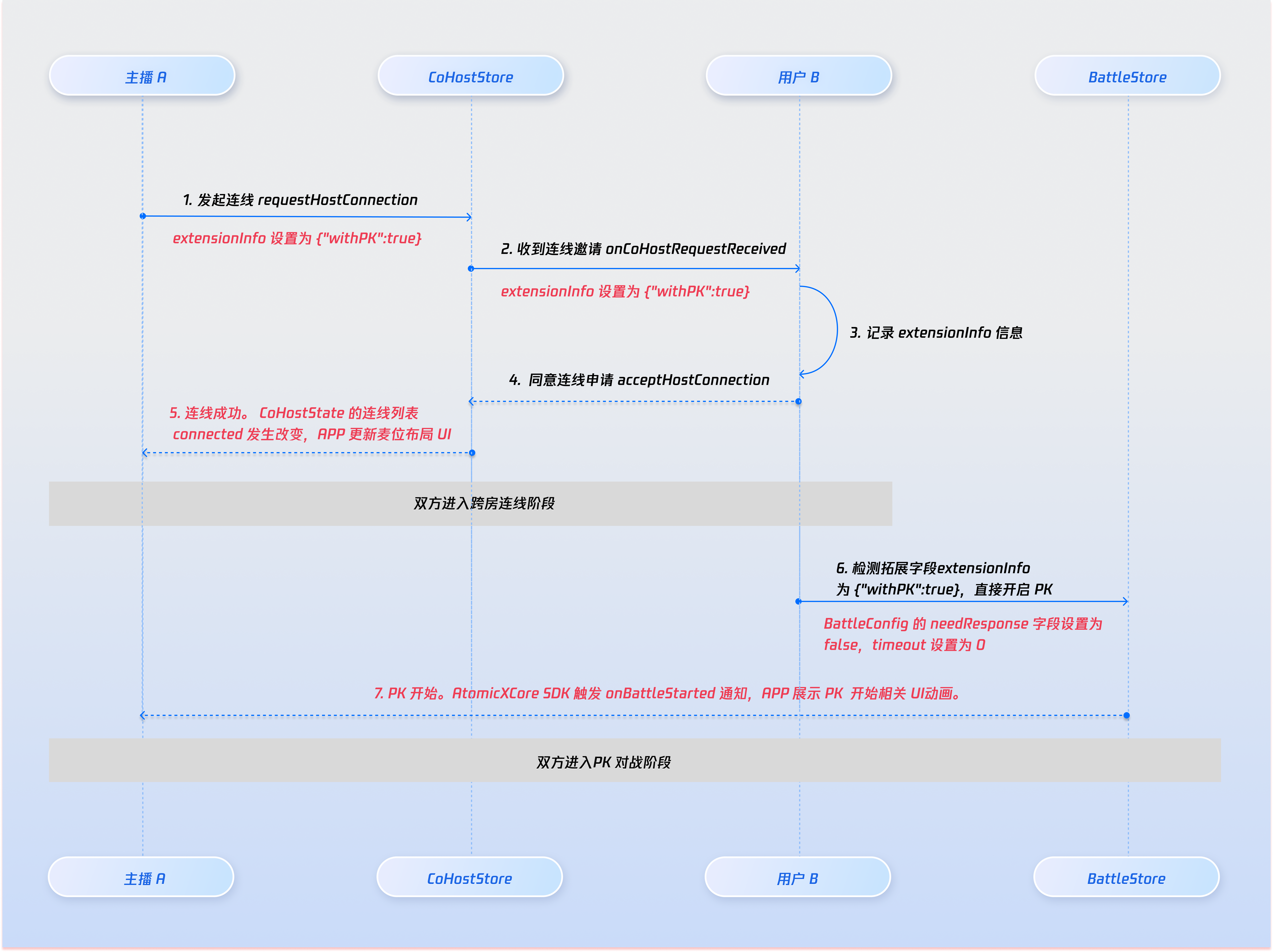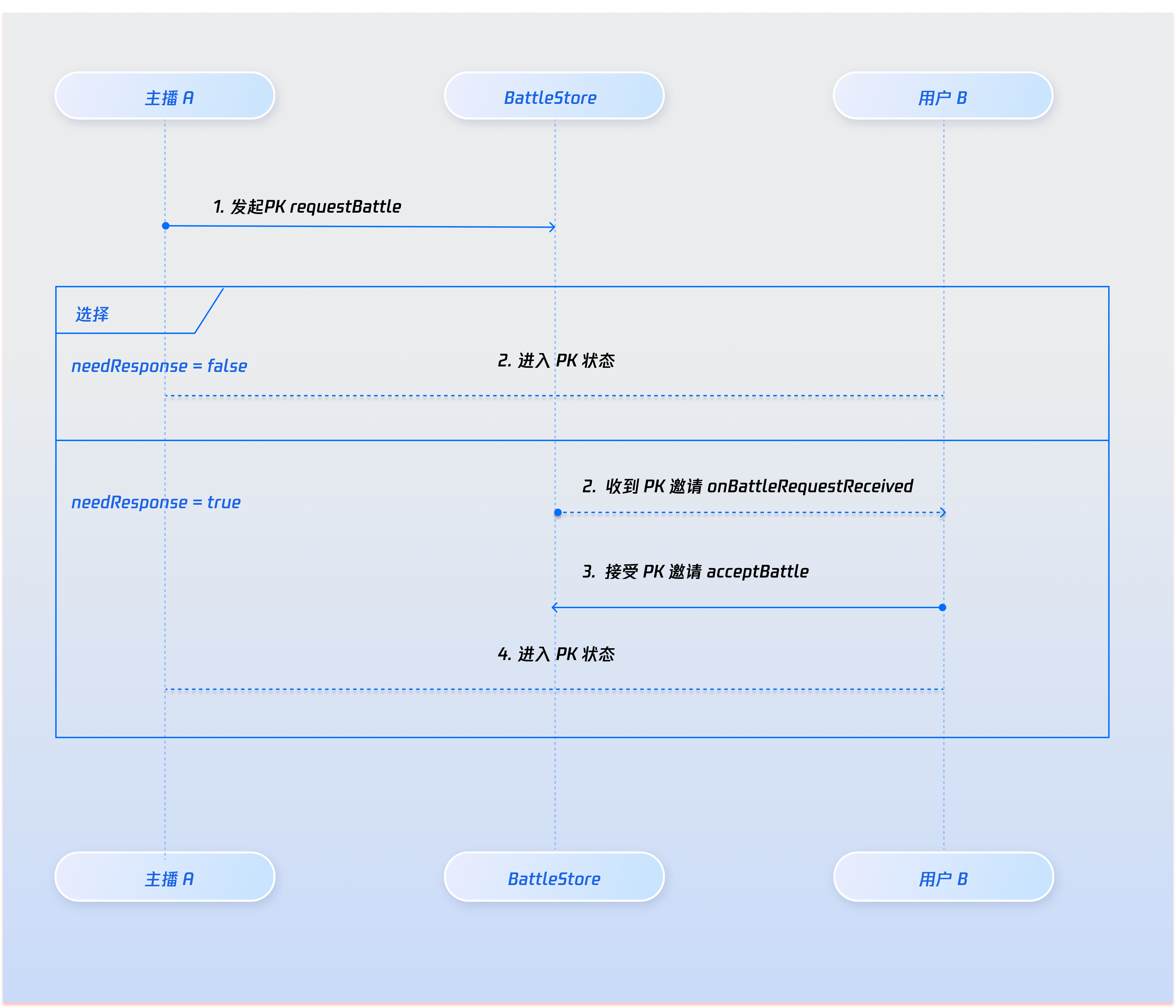 BattleEventPublisher 的 onBattleStarted 回调之后,可以在 UI 上渲染 PK 进度条。needResponse 设置为 false, 则当邀请成功发出后,会自动进入 PK 状态。needResponse 设置为 true,则当被邀请的所有对端主播都调用 BattleStore 的 acceptBattle 接口同意后进入 PK 状态。needResponse 设置为 true,若对端主播同意 PK,则已加入 PK 的主播会收到 BattleEventPublisher 的 onUserJoinBattle 回调。BattleEventPublisher 的 onBattleStarted 回调。