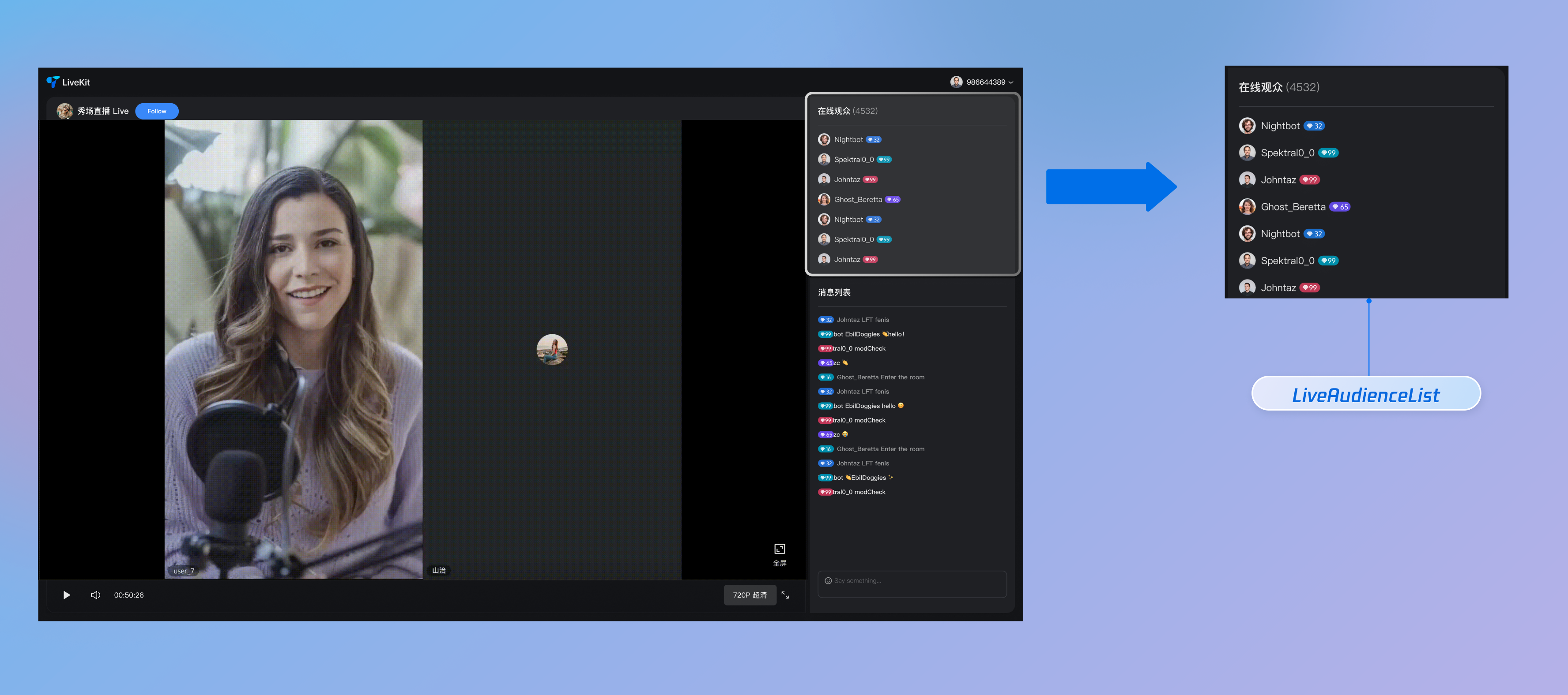LiveAudienceState 是 AtomicXCore 中专门负责管理直播间观众信息的模块。通过 LiveAudienceState 您可以为您的直播应用构建一套完整的观众列表及管理系统。
