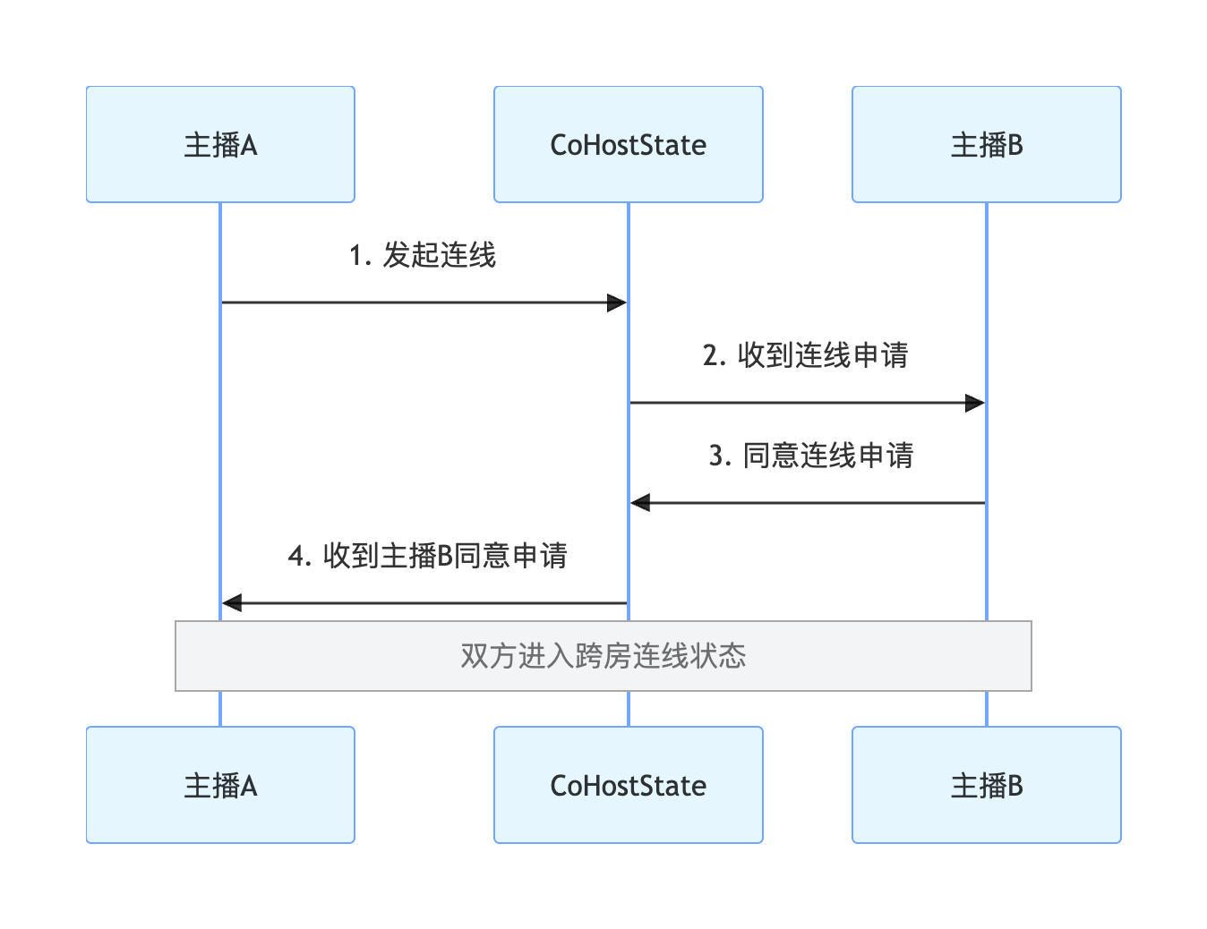 useCoHostState 提供的 subscribeEvent 方法订阅对应的事件,您可以接收到主播 B 的处理结果。import { useCoHostState, CoHostEvent } from "tuikit-atomicx-vue3";import { onMounted, onUnmounted } from 'vue';const { subscribeEvent, unsubscribeEvent } = useCoHostState();const onAccepted = (eventInfo: any) => {console.log(`主播 ${eventInfo.invitee.userName} 同意了您的连线邀请`);};const onRejected = (eventInfo: any) => {console.log(`主播 ${eventInfo.invitee.userName} 拒绝了您的连线邀请`);};const onTimeout = (eventInfo: any) => {console.log('邀请超时,对方未回应');};onMounted(() => {subscribeEvent(CoHostEvent.onCoHostRequestAccepted, onAccepted);subscribeEvent(CoHostEvent.onCoHostRequestRejected, onRejected);subscribeEvent(CoHostEvent.onCoHostRequestTimeout, onTimeout);});onUnmounted(() => {unsubscribeEvent(CoHostEvent.onCoHostRequestAccepted, onAccepted);unsubscribeEvent(CoHostEvent.onCoHostRequestRejected, onRejected);unsubscribeEvent(CoHostEvent.onCoHostRequestTimeout, onTimeout);});