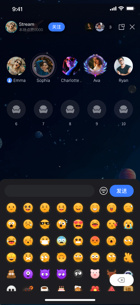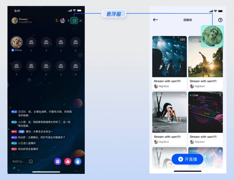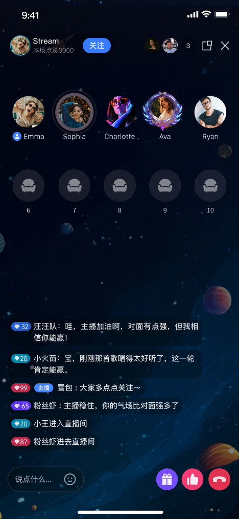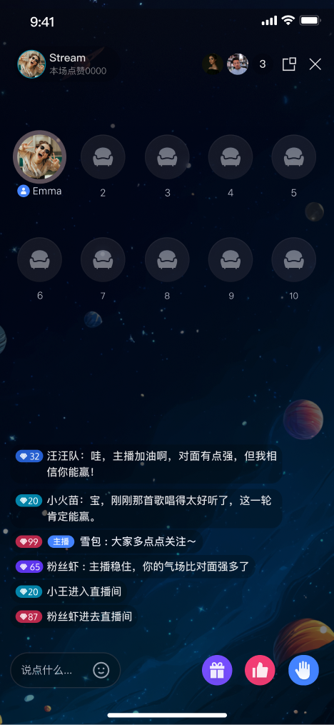 TUILiveKit 语聊房为纯音频直播场景提供了开箱即用的全功能界面。它支持快速搭建观众观看、上麦互动所需的核心能力,让您无需关注复杂的 UI 与麦位管理逻辑。收听直播 | 上麦互动 | 直播间信息 | 观众互动 |