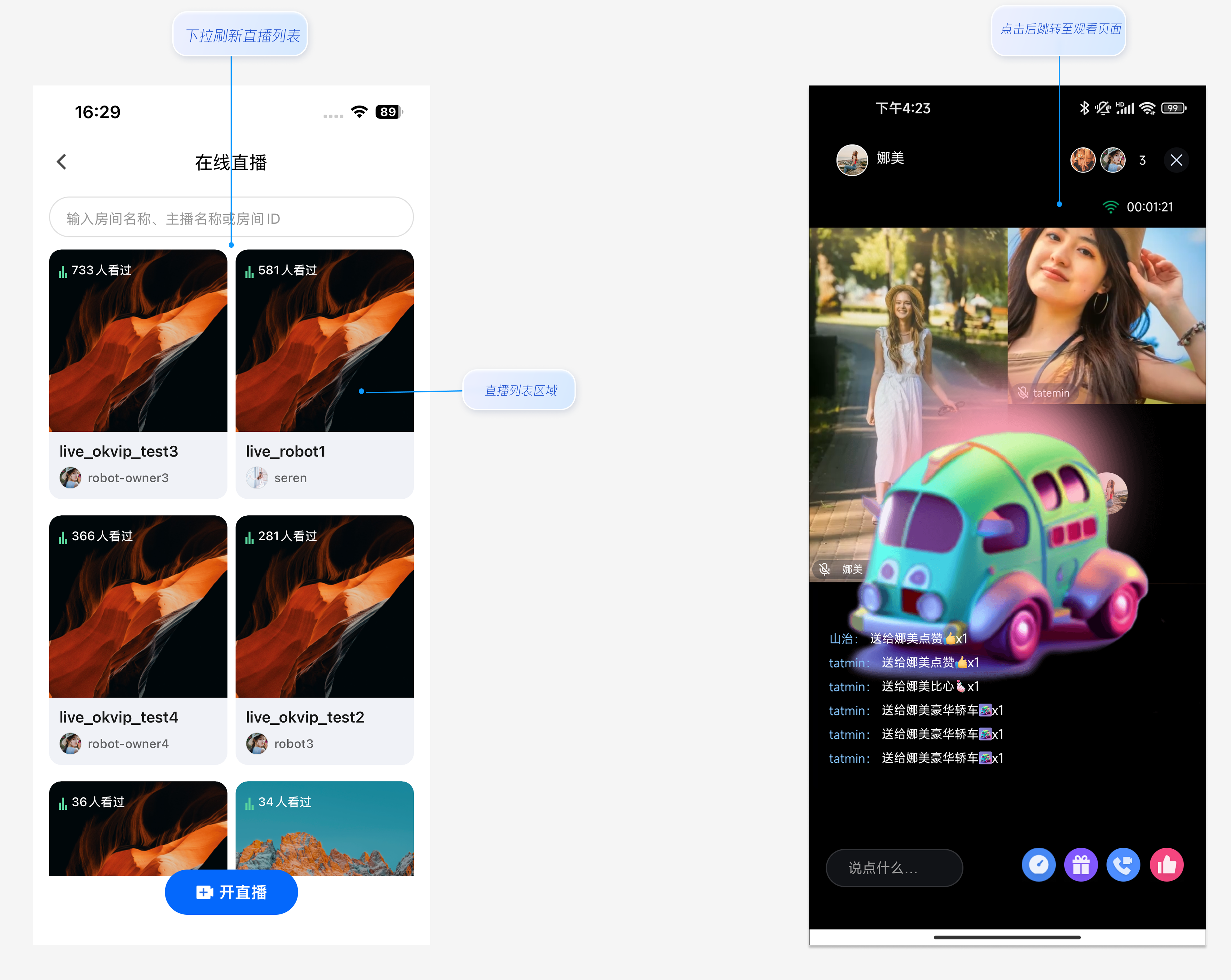 TUILiveKit 支持灵活定制直播列表页的功能和样式,您可根据业务需求调整布局。tuikit-atomic-x/src/components/LiveList.tsx 文件。const CARD_WIDTH = (SCREEN_WIDTH - CONTAINER_PADDING * 2 - CARD_GAP) / 2; // 一行两个// 将直播列表分组,每行两个元素const groupedLiveList = useMemo(() => {const groups: LiveInfoParam[][] = [];for (let i = 0; i < filteredLiveList.length; i += 2) {groups.push(filteredLiveList.slice(i, i + 2));}return groups;}, [filteredLiveList]);