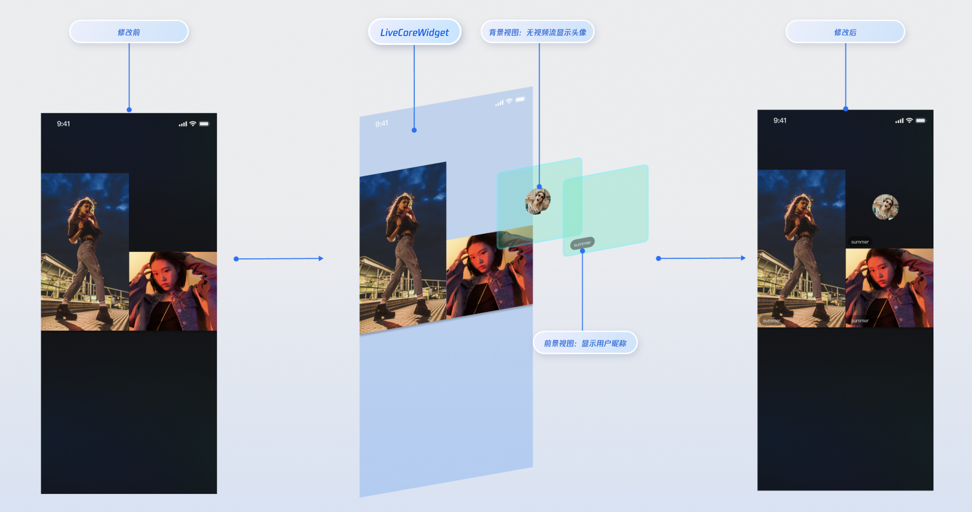 LiveCoreWidget | 直播视频流展示与交互的核心视图组件:负责视频流渲染和视图挂件处理,支持主播直播、观众连麦、主播连线等场景。 | |