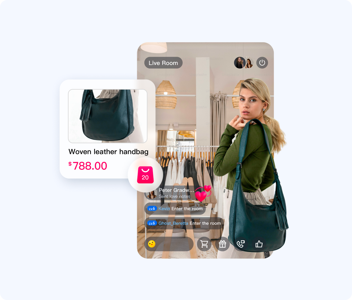 updateLiveMetaData 接口设置到一个自定义的 key(例如 "product_info")中。AtomicXCore 会将这个变更实时同步给所有观众。观众端只需订阅 LiveListState.currentLive,监听 metaData 的变化,一旦发现 product_info 的值更新,就解析其中的 JSON 数据并刷新商品卡片 UI。import 'dart:convert';import 'package:flutter/material.dart';import 'package:atomic_x_core/atomicxcore.dart';/// 商品信息模型class Product {final String id;final String name;final String price;final String imageUrl;Product({required this.id,required this.name,required this.price,required this.imageUrl,});factory Product.fromJson(Map<String, dynamic> json) {return Product(id: json['id'] ?? '',name: json['name'] ?? '',price: json['price'] ?? '',imageUrl: json['imageUrl'] ?? '',);}Map<String, dynamic> toJson() {return {'id': id,'name': name,'price': price,'imageUrl': imageUrl,};}}/// 主播端:推送商品信息class HostProductController {final _liveListStore = LiveListStore.shared;Future<void> pushProductInfo(Product product) async {final jsonString = jsonEncode(product.toJson());final metaData = {'product_info': jsonString};// 使用全局单例的 liveListStore 来更新 metaDatafinal result = await _liveListStore.updateLiveMetaData(metaData);if (result.isSuccess) {debugPrint('商品 ${product.name} 信息推送成功');} else {debugPrint('商品信息推送失败: ${result.message}');}}}/// 观众端:商品卡片组件class ProductCardWidget extends StatefulWidget {const ProductCardWidget({super.key});@overrideState<ProductCardWidget> createState() => _ProductCardWidgetState();}class _ProductCardWidgetState extends State<ProductCardWidget> {final _liveListStore = LiveListStore.shared;Product? _currentProduct;String? _lastProductInfo;late final VoidCallback _currentLiveChangedListener = _onCurrentLiveChanged;@overridevoid initState() {super.initState();_liveListStore.liveState.currentLive.addListener(_currentLiveChangedListener);}void _onCurrentLiveChanged() {final currentLive = _liveListStore.liveState.currentLive.value;final productInfo = currentLive.metaData['product_info'];// 检查是否有变化if (productInfo != _lastProductInfo) {_lastProductInfo = productInfo;_parseProductInfo(productInfo);}}void _parseProductInfo(String? jsonString) {if (jsonString == null || jsonString.isEmpty) {setState(() => _currentProduct = null);return;}try {final json = jsonDecode(jsonString) as Map<String, dynamic>;final product = Product.fromJson(json);setState(() => _currentProduct = product);} catch (e) {debugPrint('解析商品信息失败: $e');}}@overridevoid dispose() {_liveListStore.liveState.currentLive.removeListener(_currentLiveChangedListener);super.dispose();}@overrideWidget build(BuildContext context) {if (_currentProduct == null) {return const SizedBox.shrink();}return Container(margin: const EdgeInsets.all(16),padding: const EdgeInsets.all(12),decoration: BoxDecoration(color: Colors.white,borderRadius: BorderRadius.circular(12),boxShadow: [BoxShadow(color: Colors.black.withOpacity(0.1),blurRadius: 8,offset: const Offset(0, 2),),],),child: Row(children: [// 商品图片ClipRRect(borderRadius: BorderRadius.circular(8),child: Image.network(_currentProduct!.imageUrl,width: 80,height: 80,fit: BoxFit.cover,errorBuilder: (context, error, stackTrace) {return Container(width: 80,height: 80,color: Colors.grey[300],child: const Icon(Icons.image),);},),),const SizedBox(width: 12),// 商品信息Expanded(child: Column(crossAxisAlignment: CrossAxisAlignment.start,mainAxisSize: MainAxisSize.min,children: [Text(_currentProduct!.name,style: const TextStyle(fontSize: 14,fontWeight: FontWeight.bold,),maxLines: 2,overflow: TextOverflow.ellipsis,),const SizedBox(height: 4),Text('¥${_currentProduct!.price}',style: const TextStyle(fontSize: 16,color: Colors.red,fontWeight: FontWeight.bold,),),],),),// 购买按钮ElevatedButton(onPressed: () {// 实现购买逻辑debugPrint('购买商品: ${_currentProduct!.name}');},style: ElevatedButton.styleFrom(backgroundColor: Colors.orange,foregroundColor: Colors.white,),child: const Text('立即购买'),),],),);}}