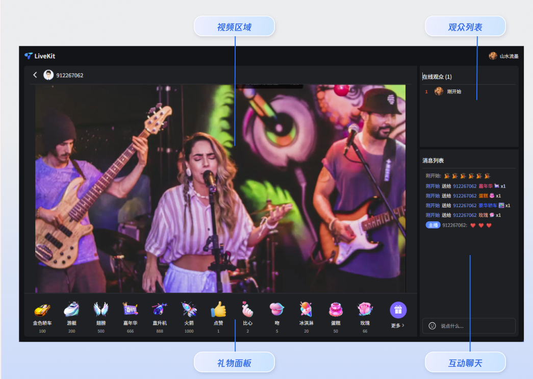 npm run dev 命令启动的浏览器页面(通常是 http://localhost:5173),此时会显示您刚刚开启的直播,从直播列表中点击,即可进入观看页面。